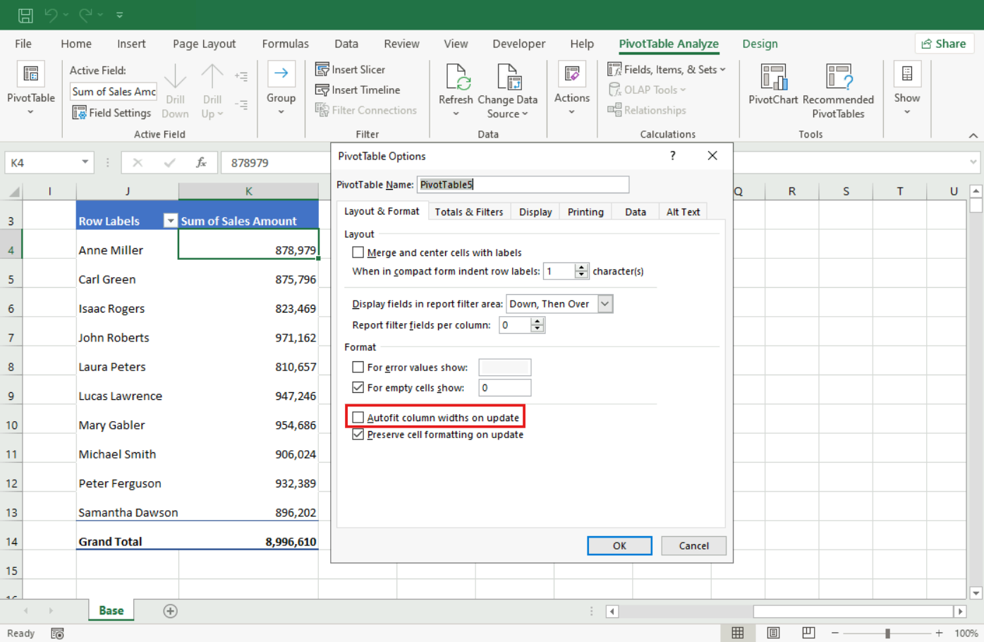 Problem: When I refresh the Pivot Table, my custom column widths disappear.