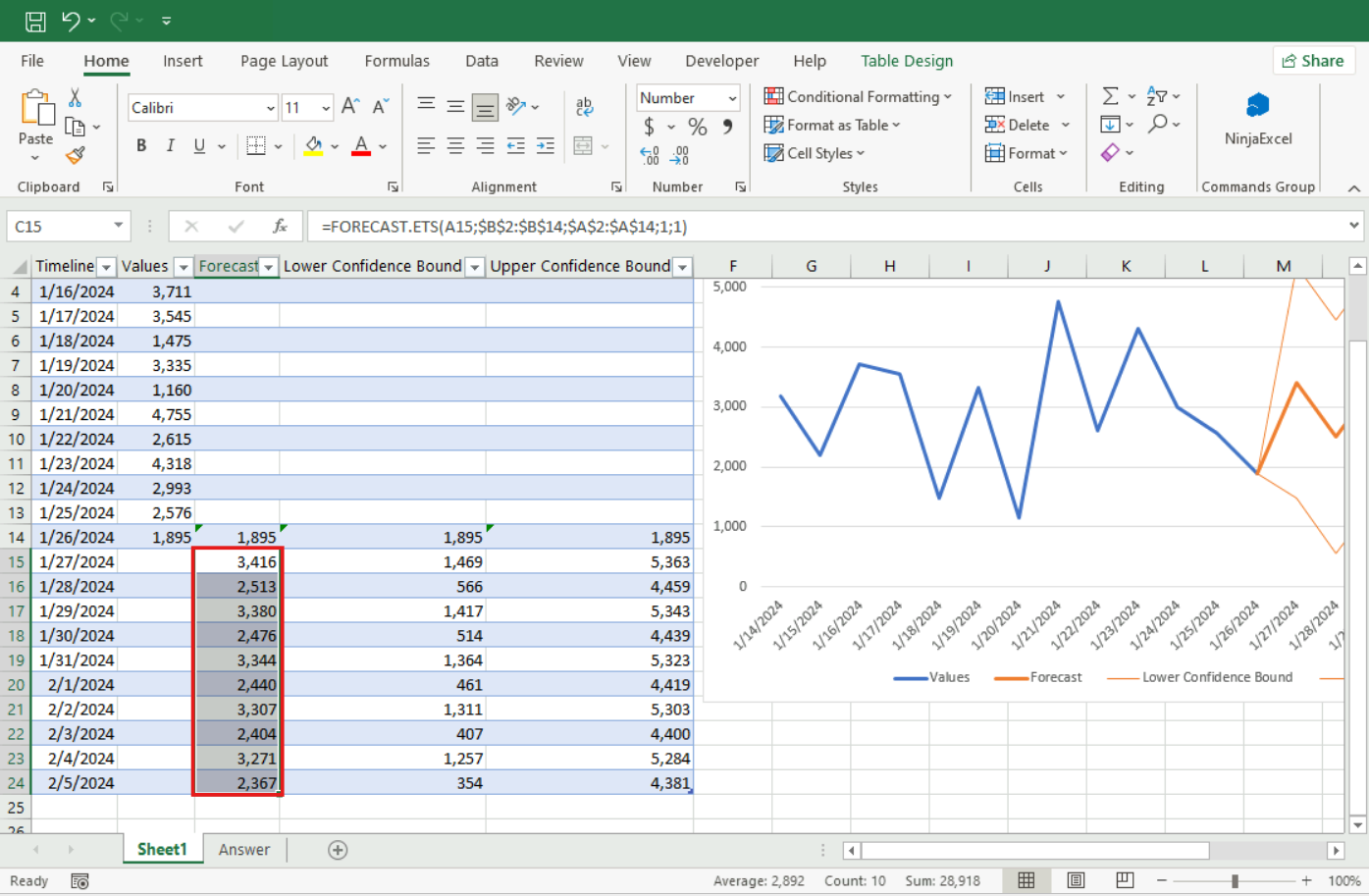 Solution: The tool generates a table with projected values. Copy only the range of the projected amounts (typically in a specific range like C14:C24) and paste them back into your original sheet.