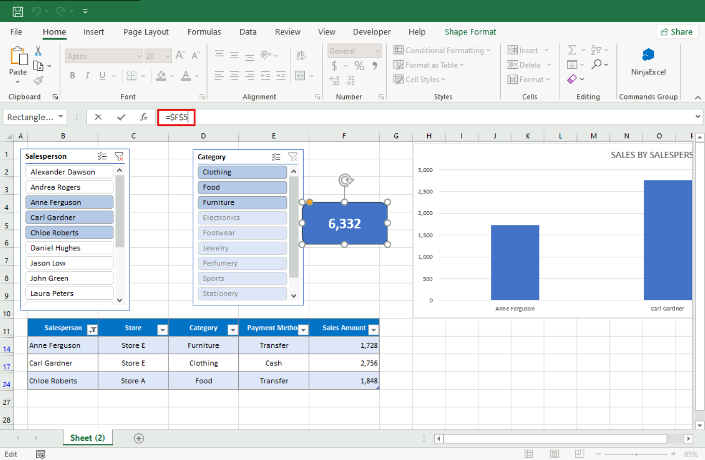 Solution: To link a shape to a cell (e.g., F5), select the border of the rectangle, click inside the Formula Bar, type =, and then click cell F5. Do not type the text inside the box manually.