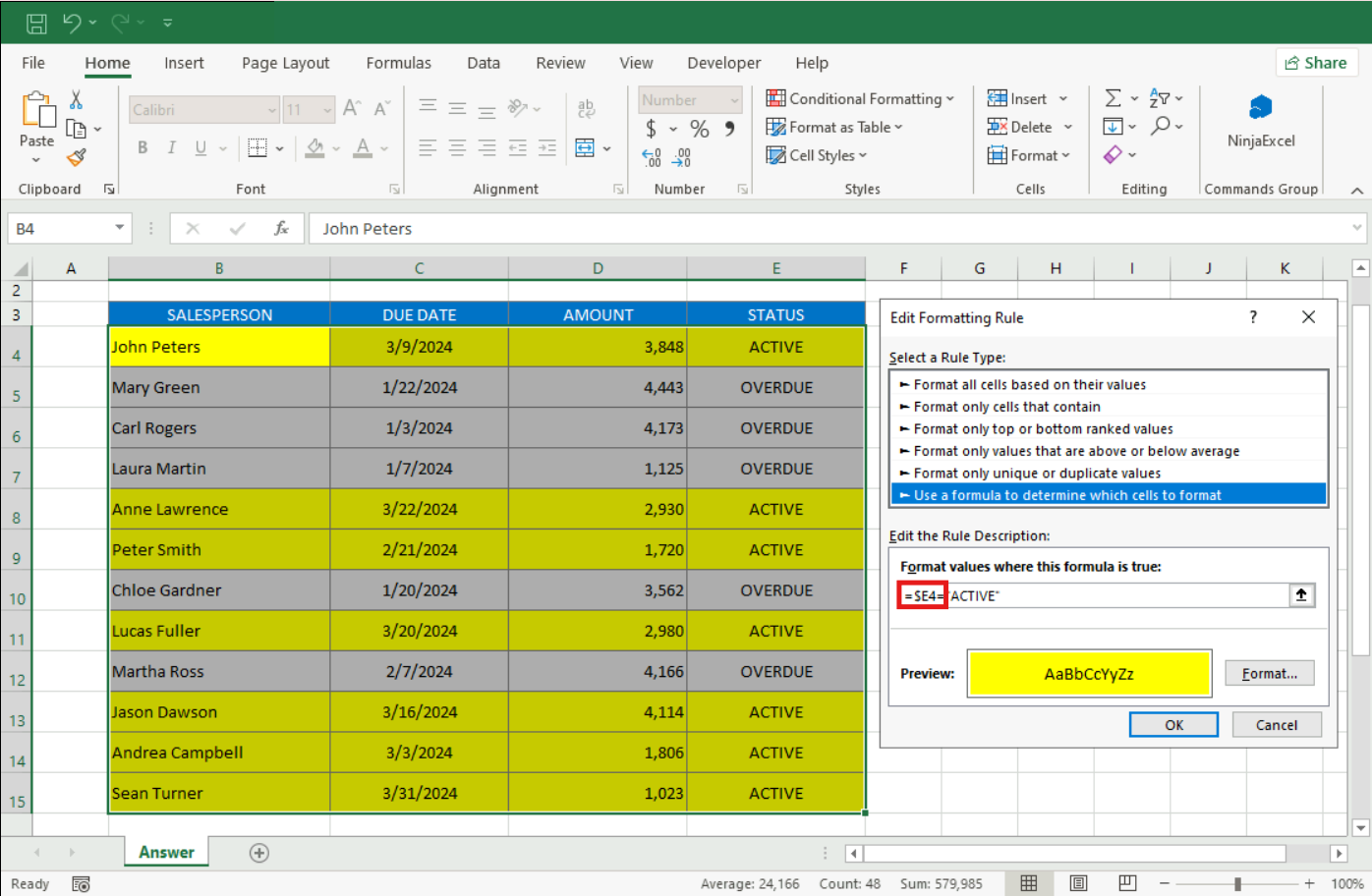 Problem: A formula-based rule isn't highlighting the entire row.