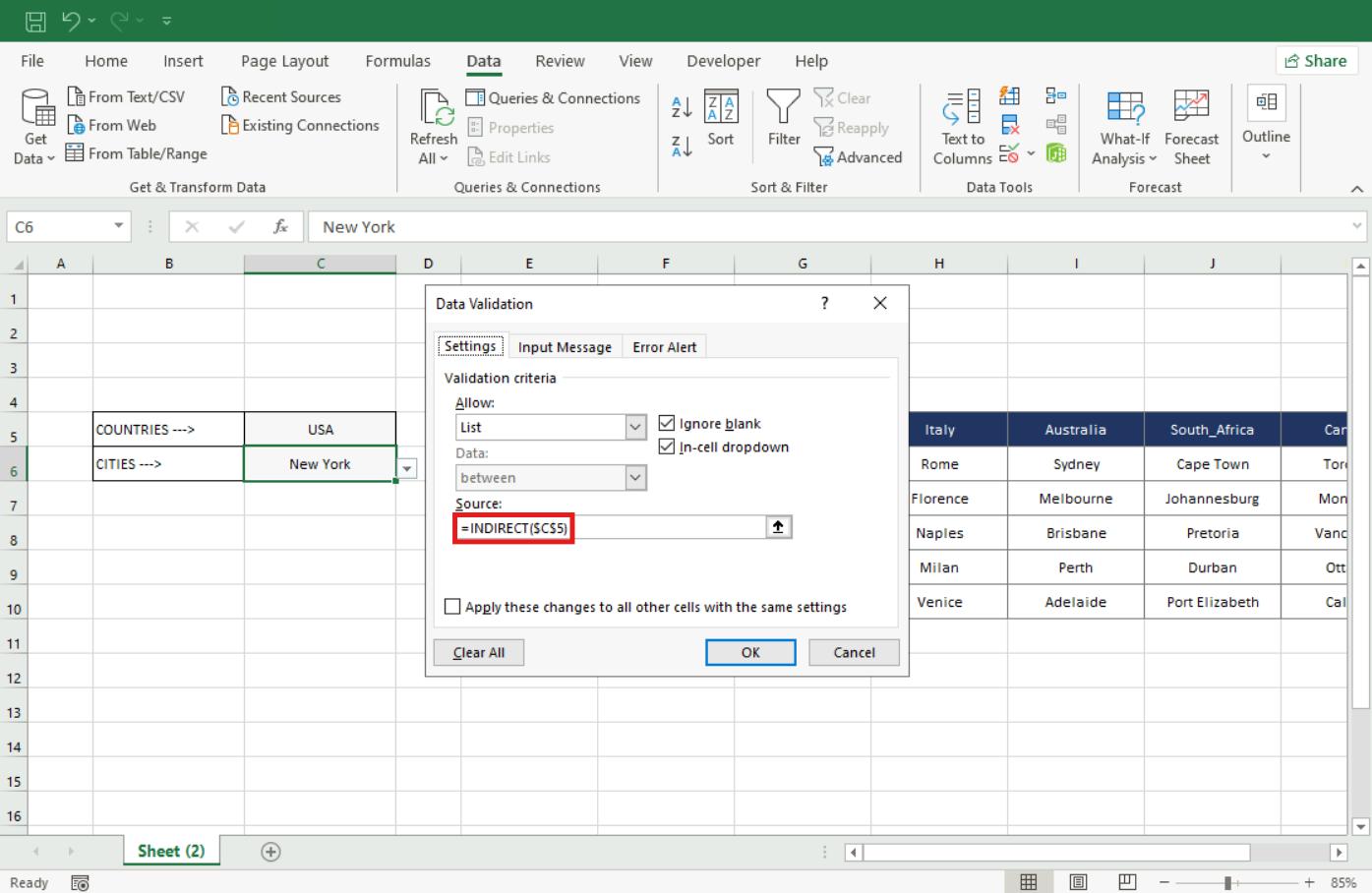 Solution: First, create your Named Ranges using the "Create from Selection" (Top row) tool. Then, in the Data Validation settings for your second list, use the INDIRECT function and make sure you are referencing the correct cell.