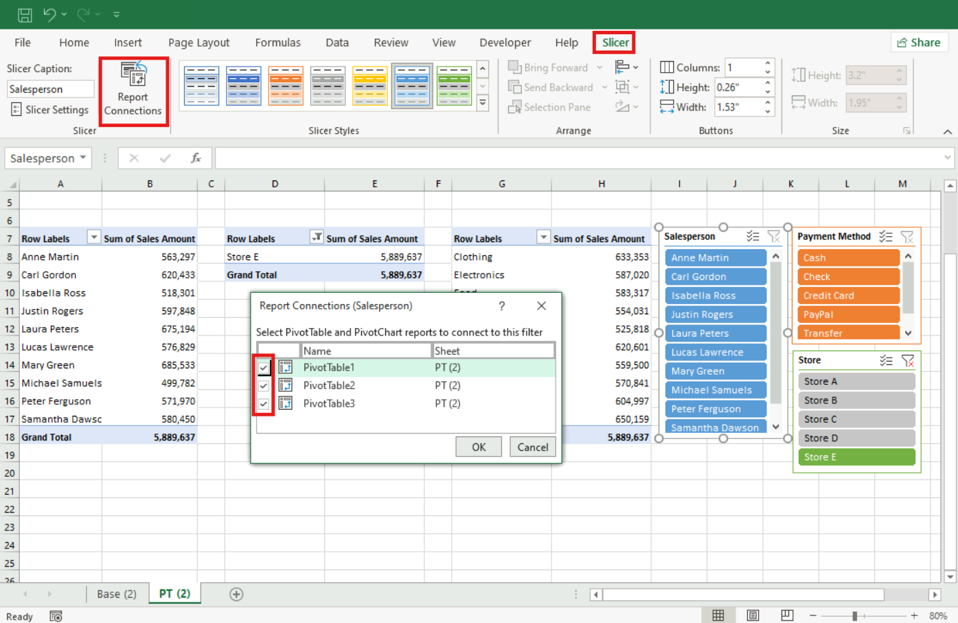 Solution: Right-click the Slicer, go to "Report Connections", and make sure you’ve checked all PivotTables that need to respond to that filter.