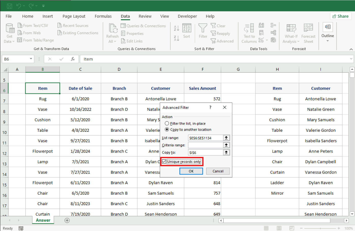 Solution: Be sure to check the"Unique records only" box in the Advanced Filter dialog box before pressing OK.