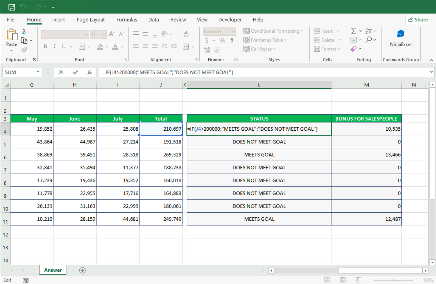 Example: If the amount in cell J4 is greater than 200,000 (>), the cell will display “MEETS GOAL”. Otherwise, it shows “DOES NOT MEET GOAL”.