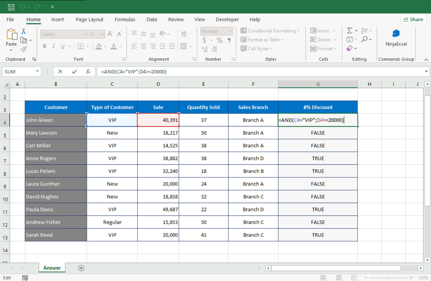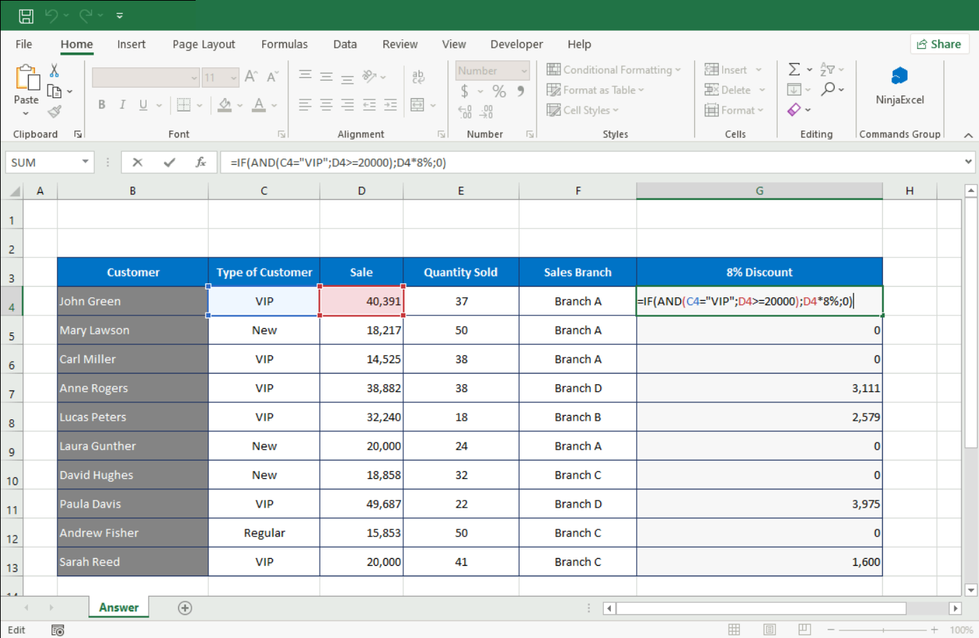 For example, an 8% discount is applied only if the customer is “VIP” (=) and the sale is greater than or equal to (>=) 20,000. Otherwise, it shows the number 0.