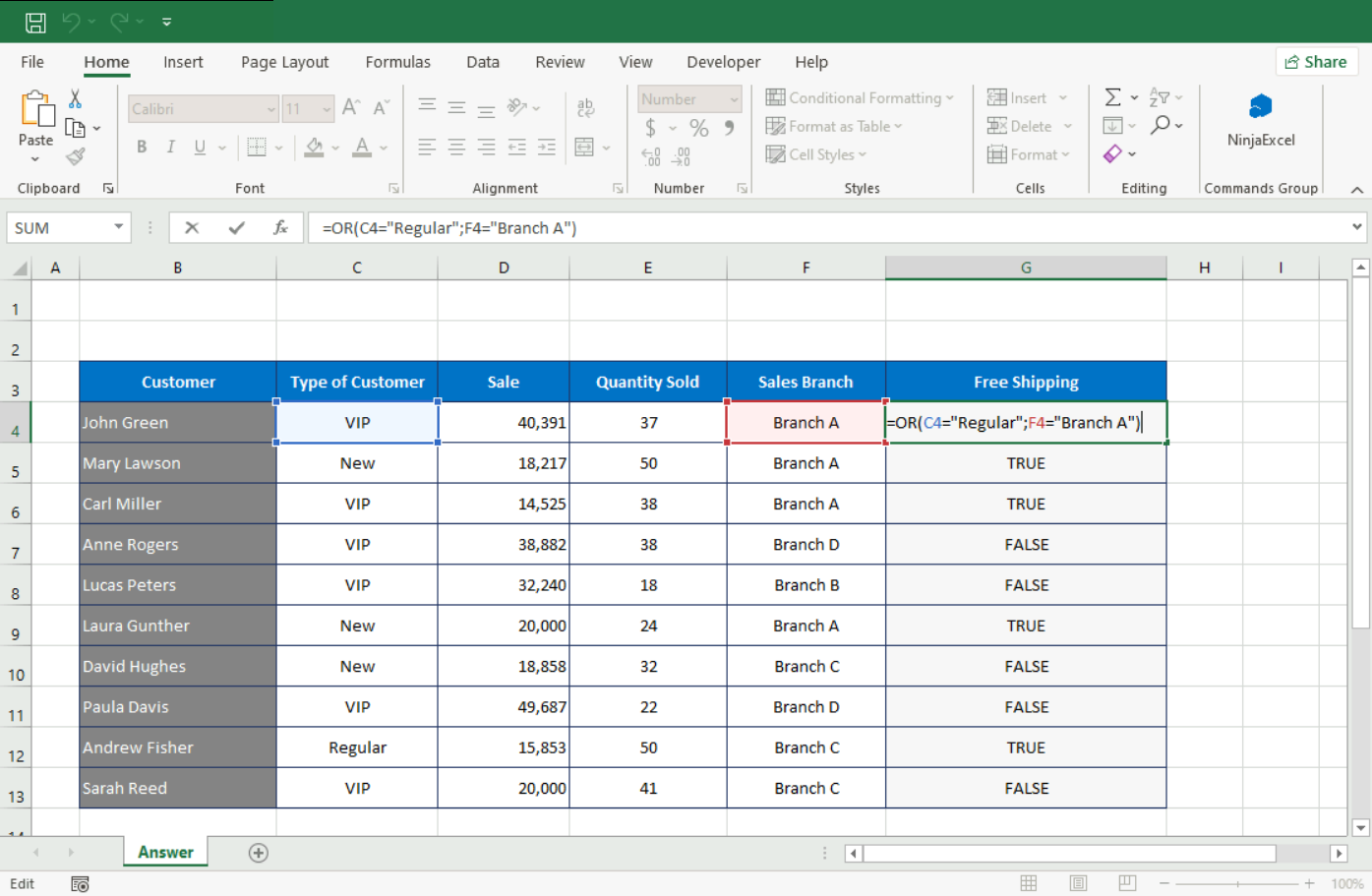 Example: Free shipping should be displayed as TRUE if the customer is “Regular” (=) or if the sale happened at Branch A (=). If none of the conditions are met, it shows FALSE.