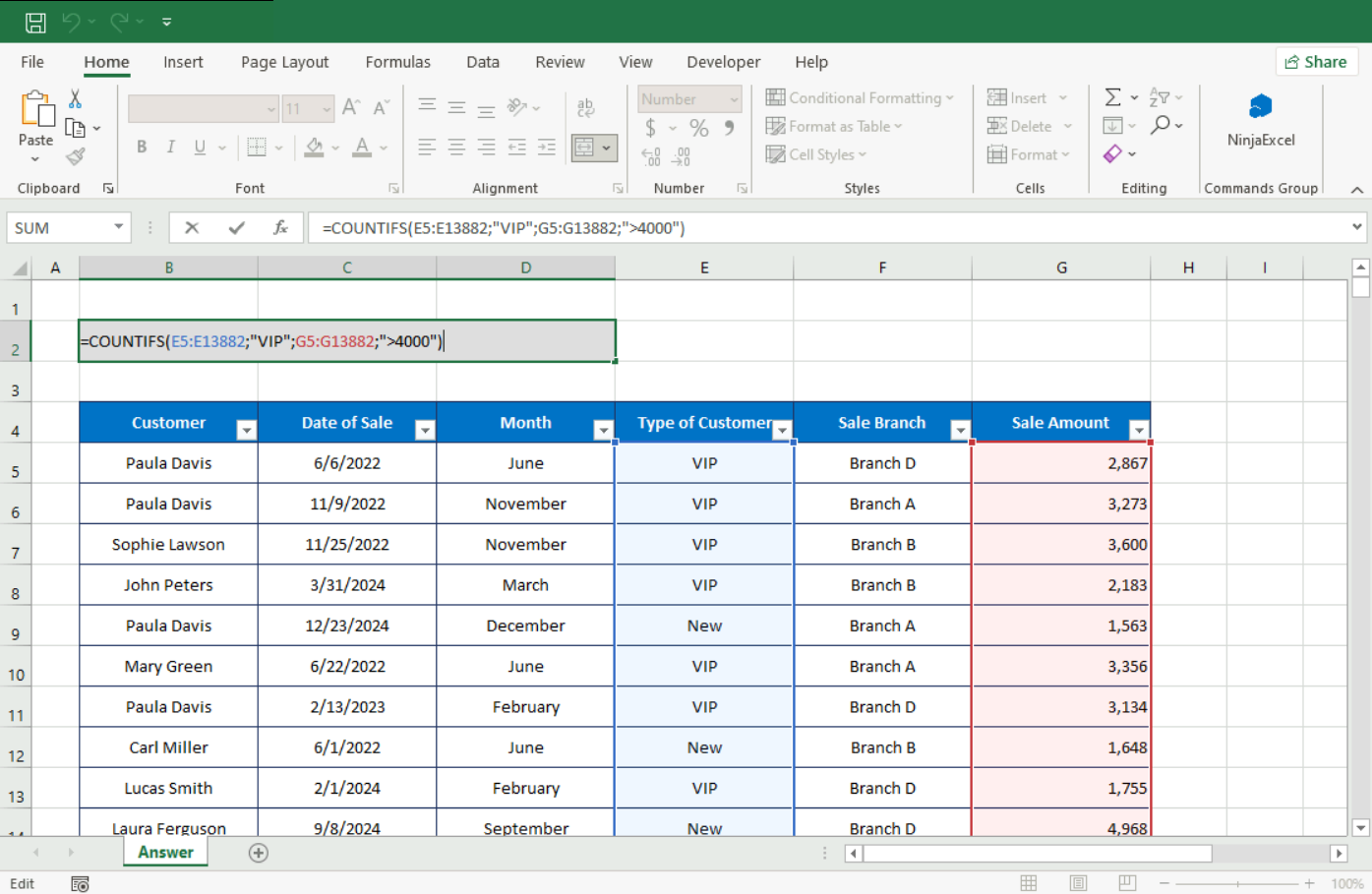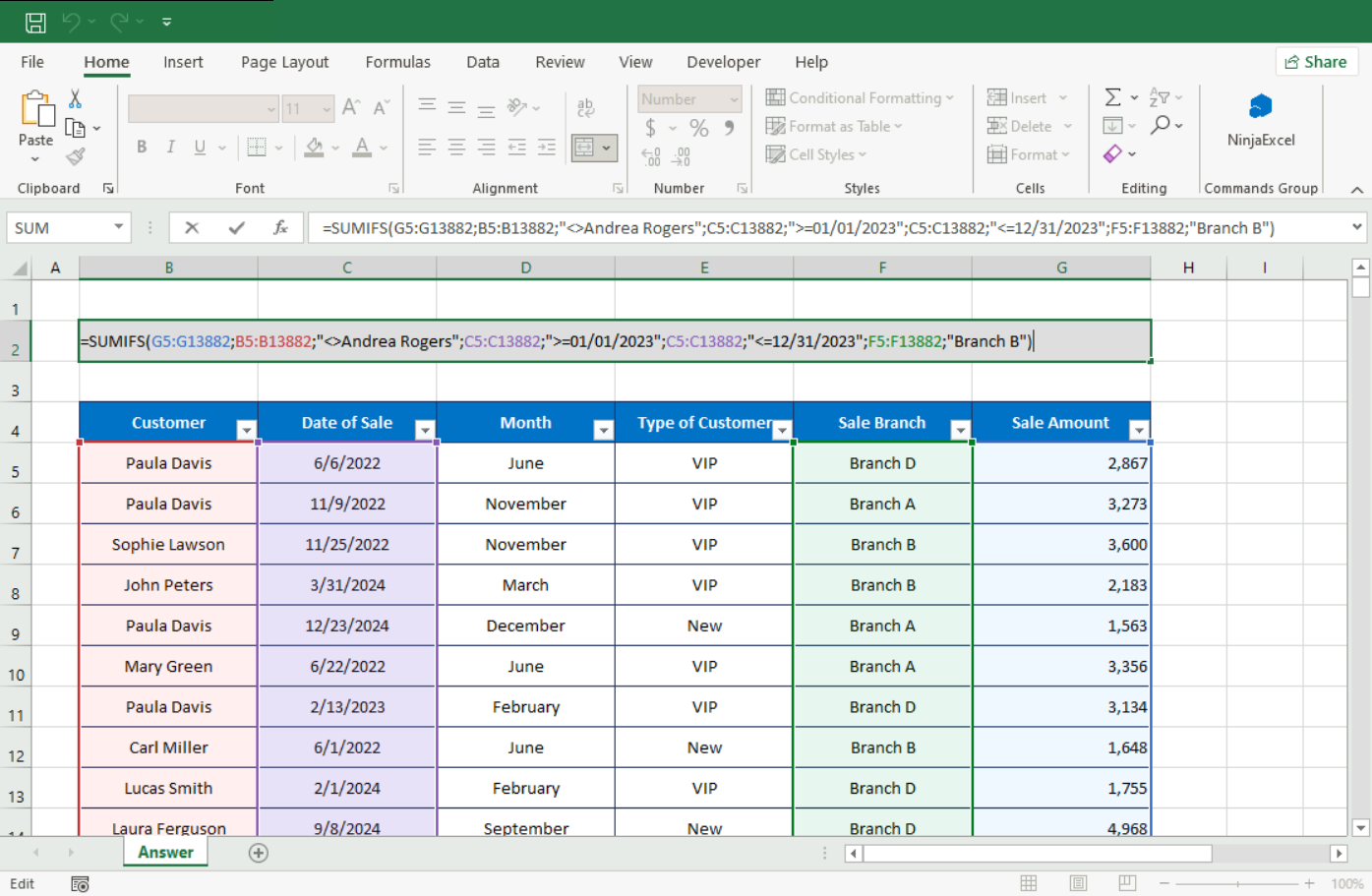 Example: Summing all sales from “Branch B” in 2023 (>=01/01/2023 and <=12/31/2023), made to customers other than Andrea Rogers (<>).