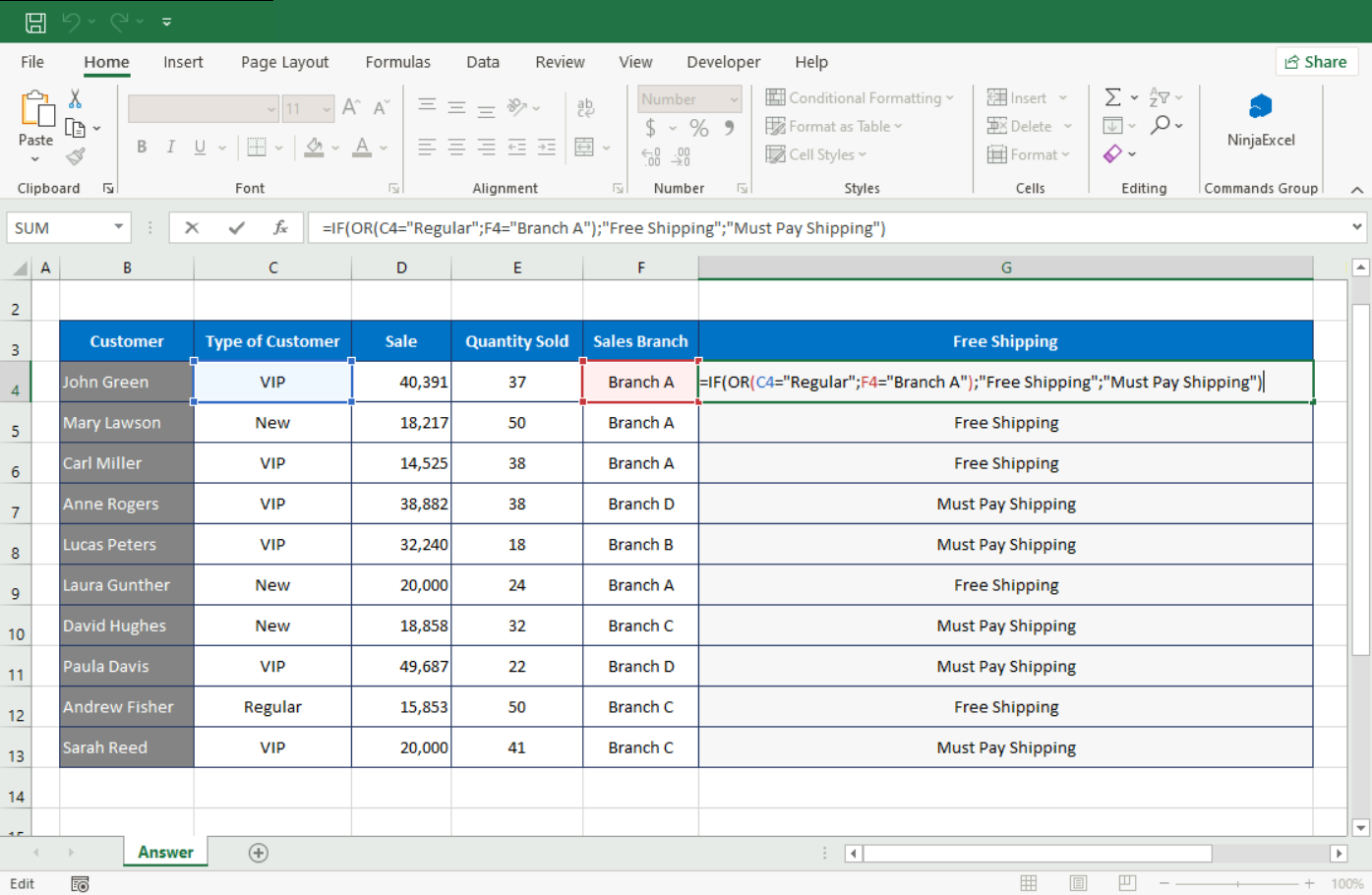 In this other example, free shipping is applied only if the customer is “Regular” (=) or if the sale happened at Branch A (=). Otherwise, it shows Must Pay Shipping.