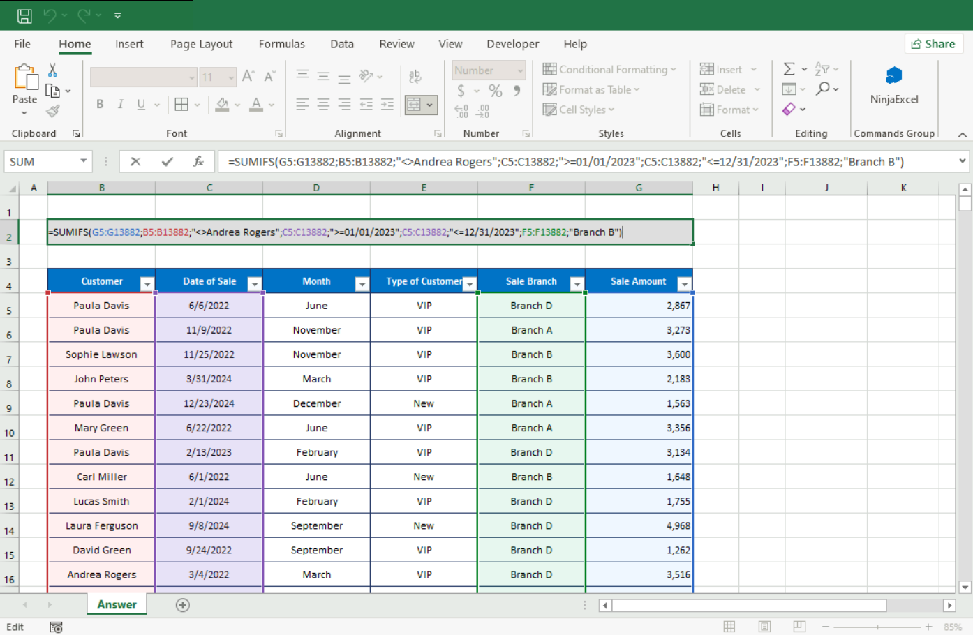 SUMIFS: This function allows you to sum based on up to 127 criteria. Using the same example, you could sum sales for a specific salesperson, in a specific city, for a specific product.