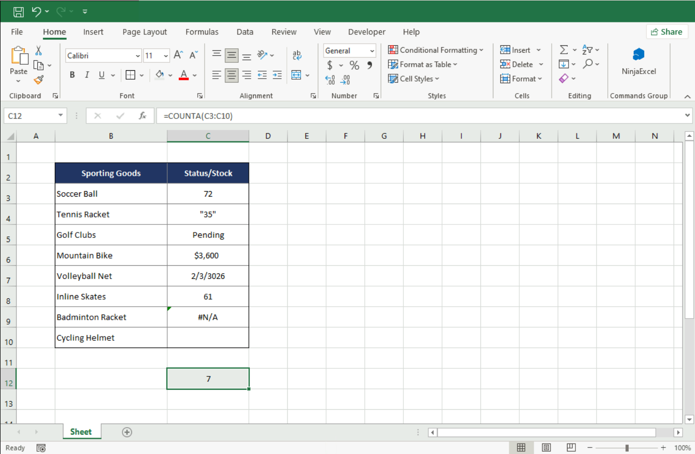 In this case, the result is 7. Unlike the previous function, COUNTA doesn’t differentiate data types; it just identifies if the cell has content or not.