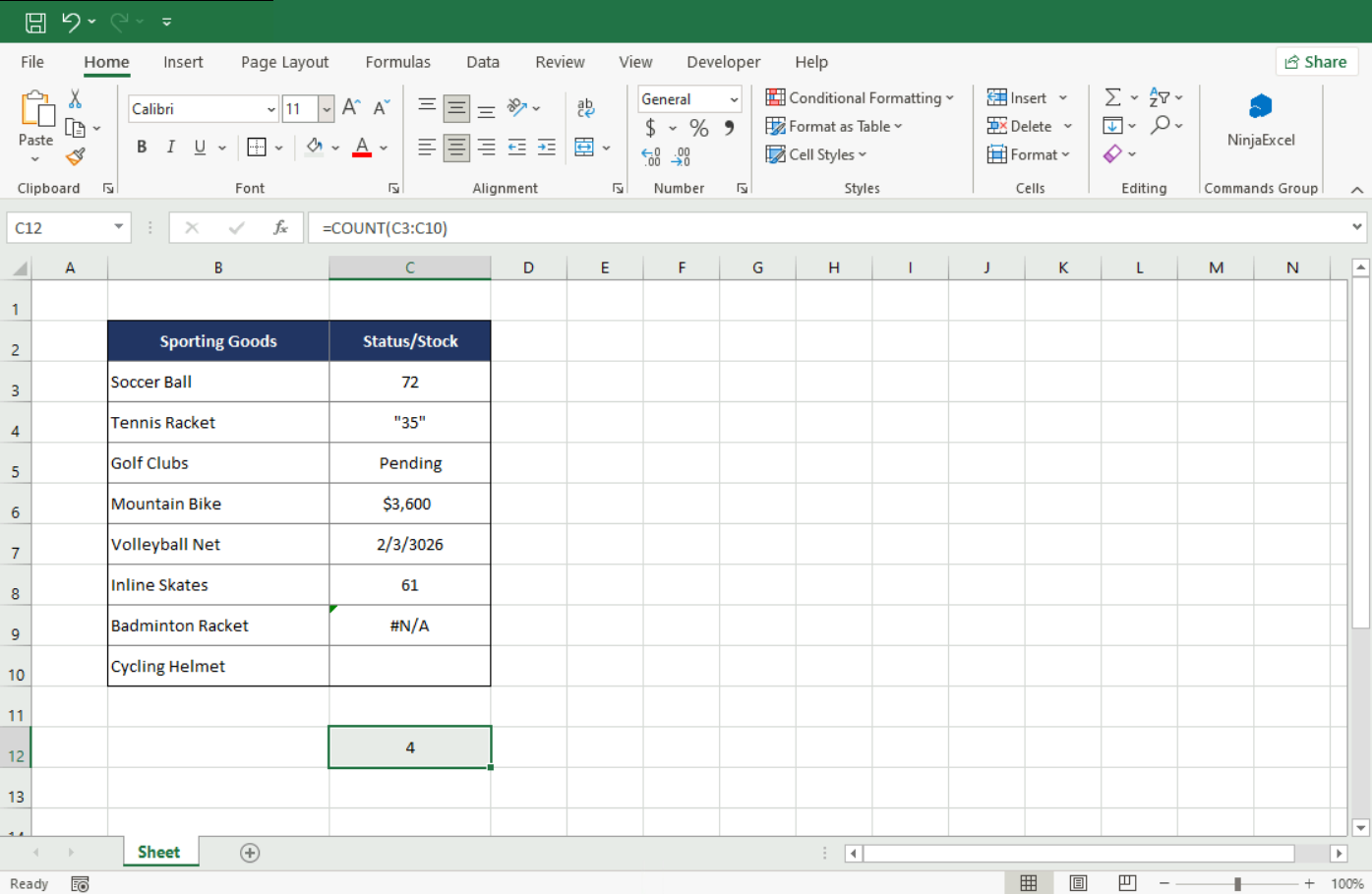 As you can see, the result of the function is 4, because COUNT has a very strict criterion: it only quantifies values that Excel can interpret mathematically.