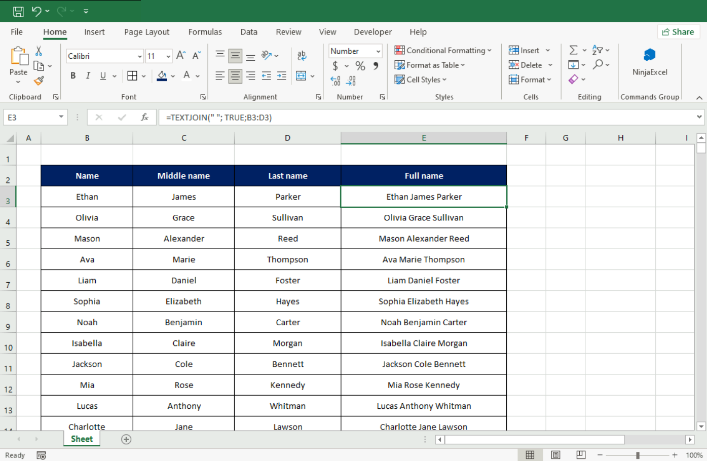 TEXTJOIN (Modern Standard): Neither CONCAT nor CONCATENATE includes automatic separators. TEXTJOIN solves this by allowing a delimiter (like a space or comma) and an option to ignore empty cells.