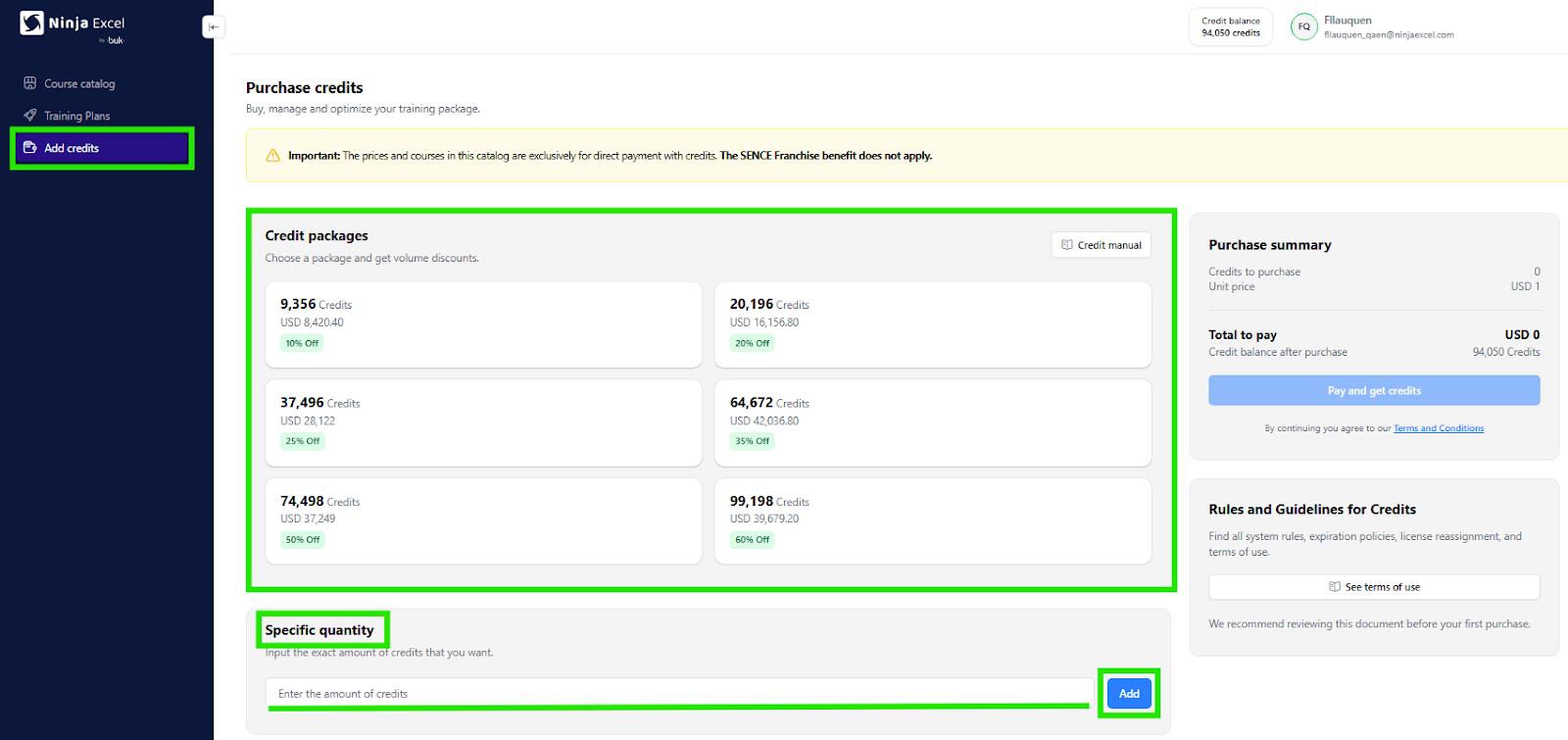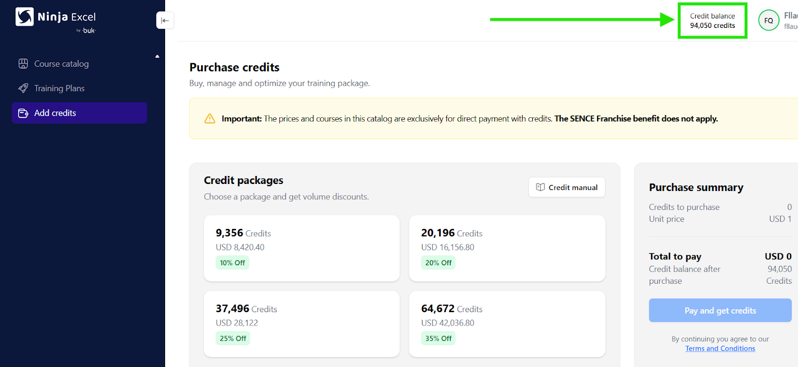 Once you’ve made your selection, the Purchase Summary will show a detailed breakdown before you pay (including the total due and any discounts in both credits and your local currency). After reviewing the details, click Pay and get credits.
