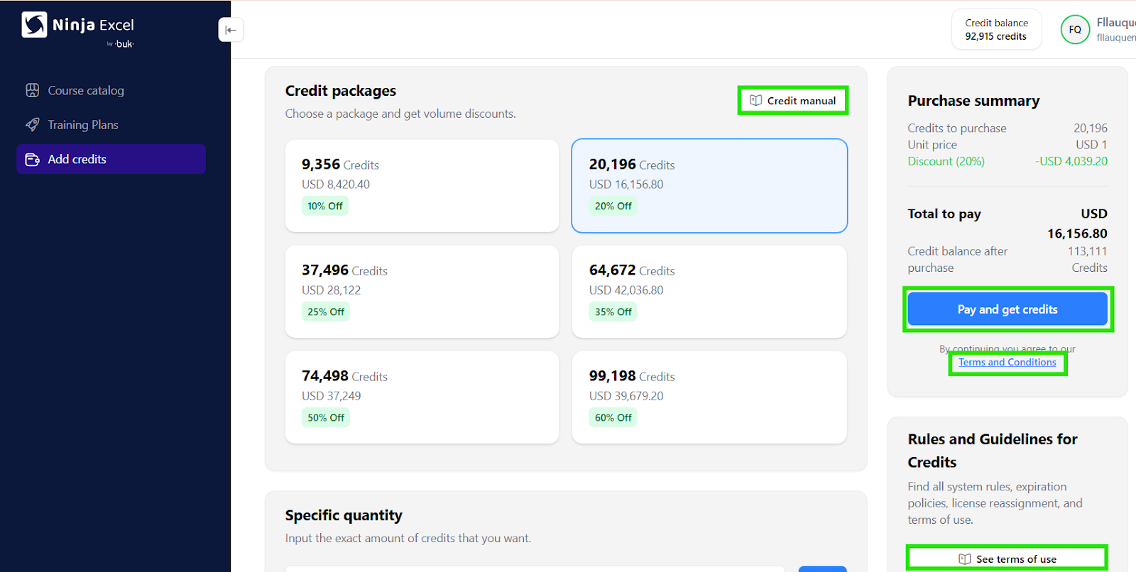 Specific quantity: This lets you enter the exact number of credits you need.