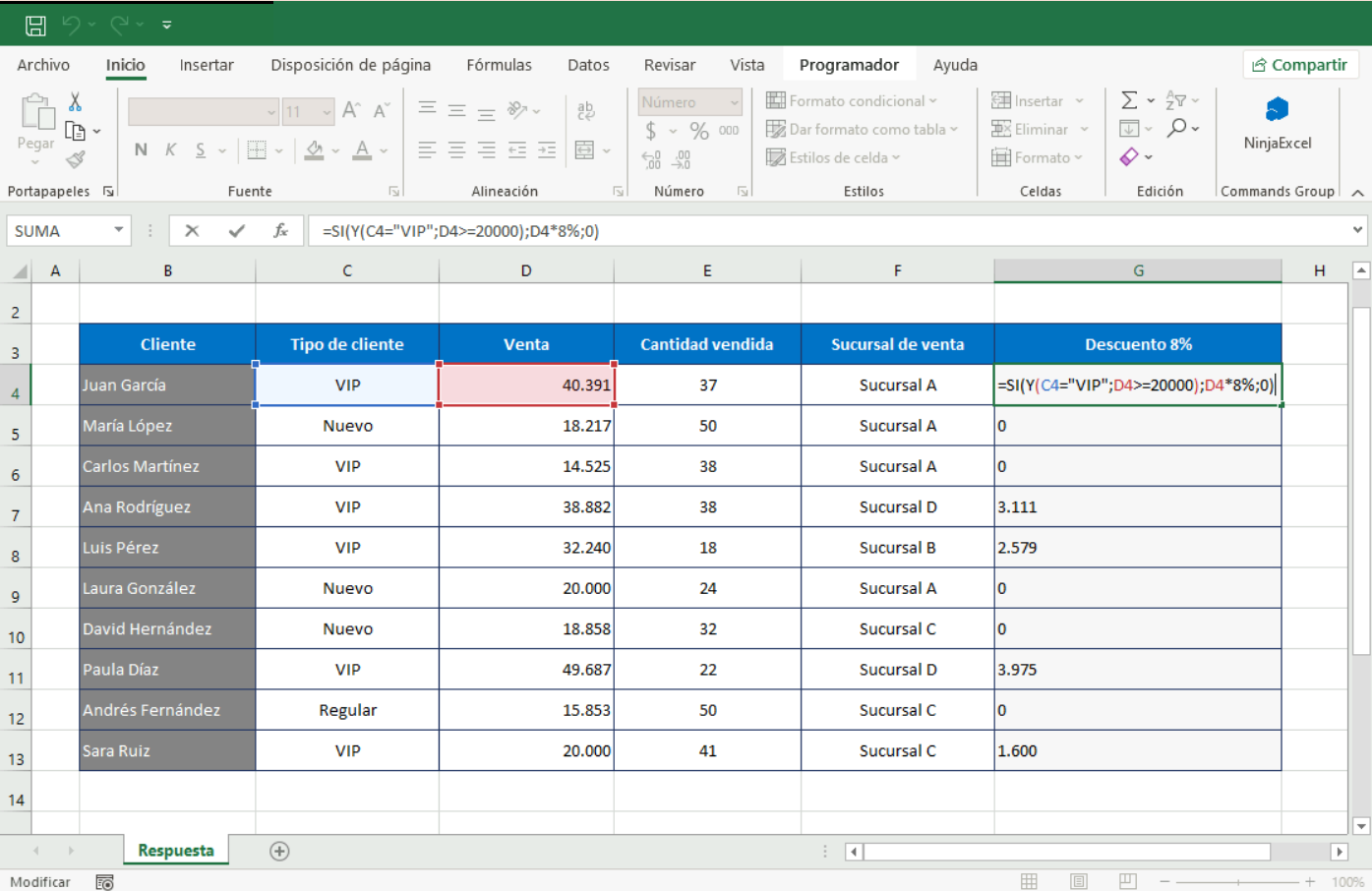 Por ejemplo, en este ejercicio se calcula un descuento del 8% sobre el valor de la venta solo si se trata de un cliente VIP (=) y de una venta mayor o igual (>=) a 20.000. En caso contrario, se reflejará el número 0.