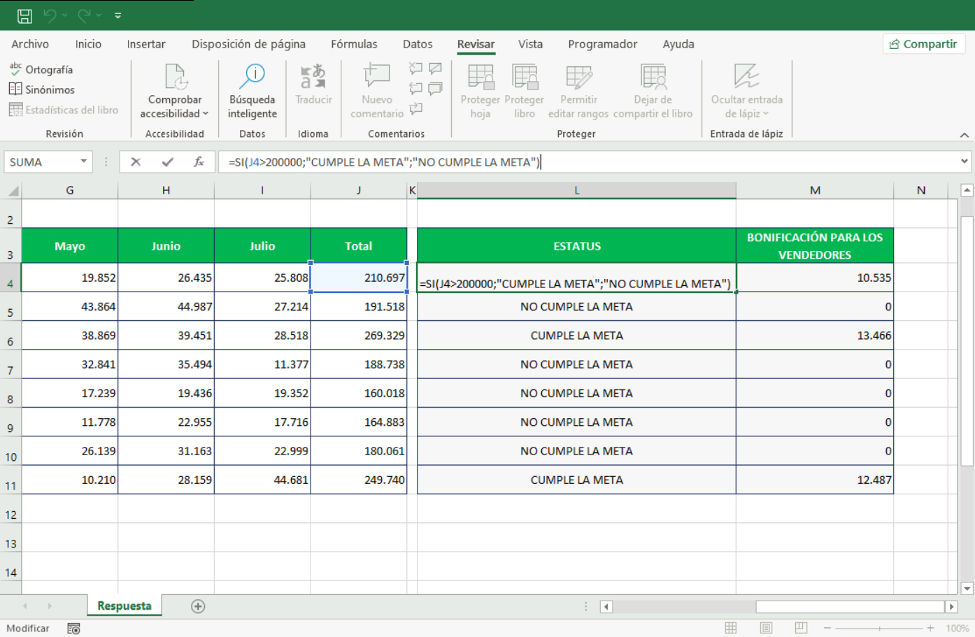 Ejemplo: En este ejercicio, si el monto en la celda J4 es mayor a 200.000 (>), se reflejará el estatus CUMPLE LA META, si no, se visualizará NO CUMPLE LA META.