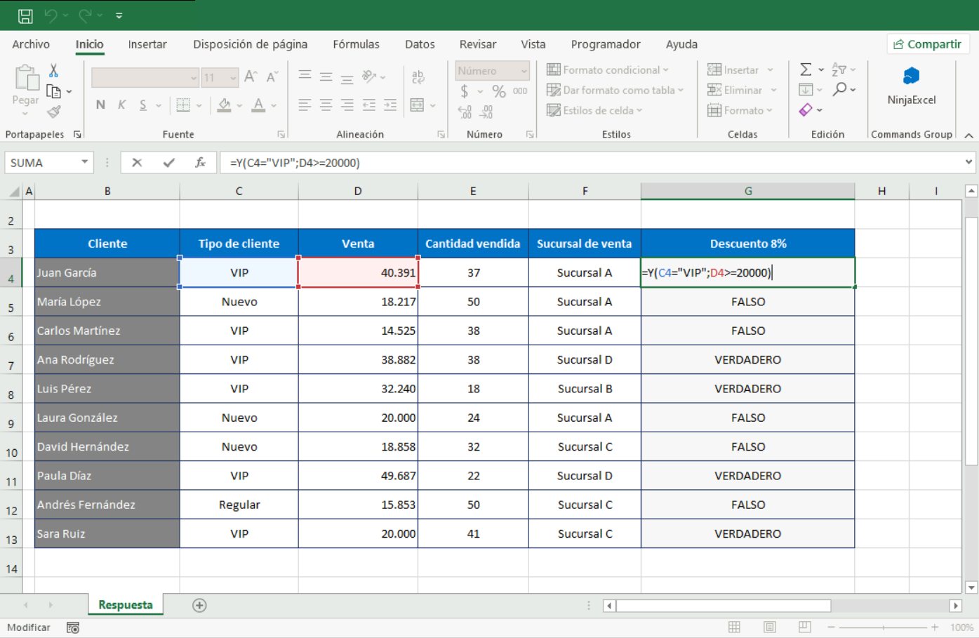 Ejemplo: En ese ejercicio, el descuento del 8% se debe reflejar como VERDADERO siempre y cuando se trate de un cliente VIP y al mismo tiempo sea una venta mayor o igual (>=) a 20.000 o como falso si al menos una de estas condiciones no se cumple.