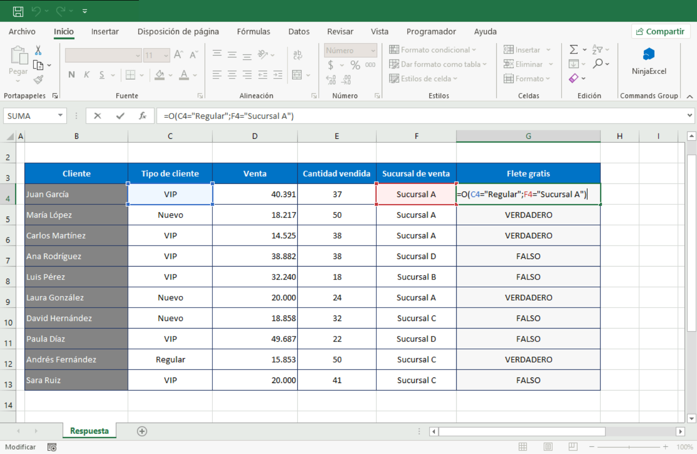 Ejemplo: En este ejercicio, el flete gratis se debe reflejar como VERDADERO si se trata de un cliente Regular (=) o si es una venta hecha en la Sucursal A (=). En caso de que ninguna de las condiciones se cumpla, se debe reflejar como FALSO.