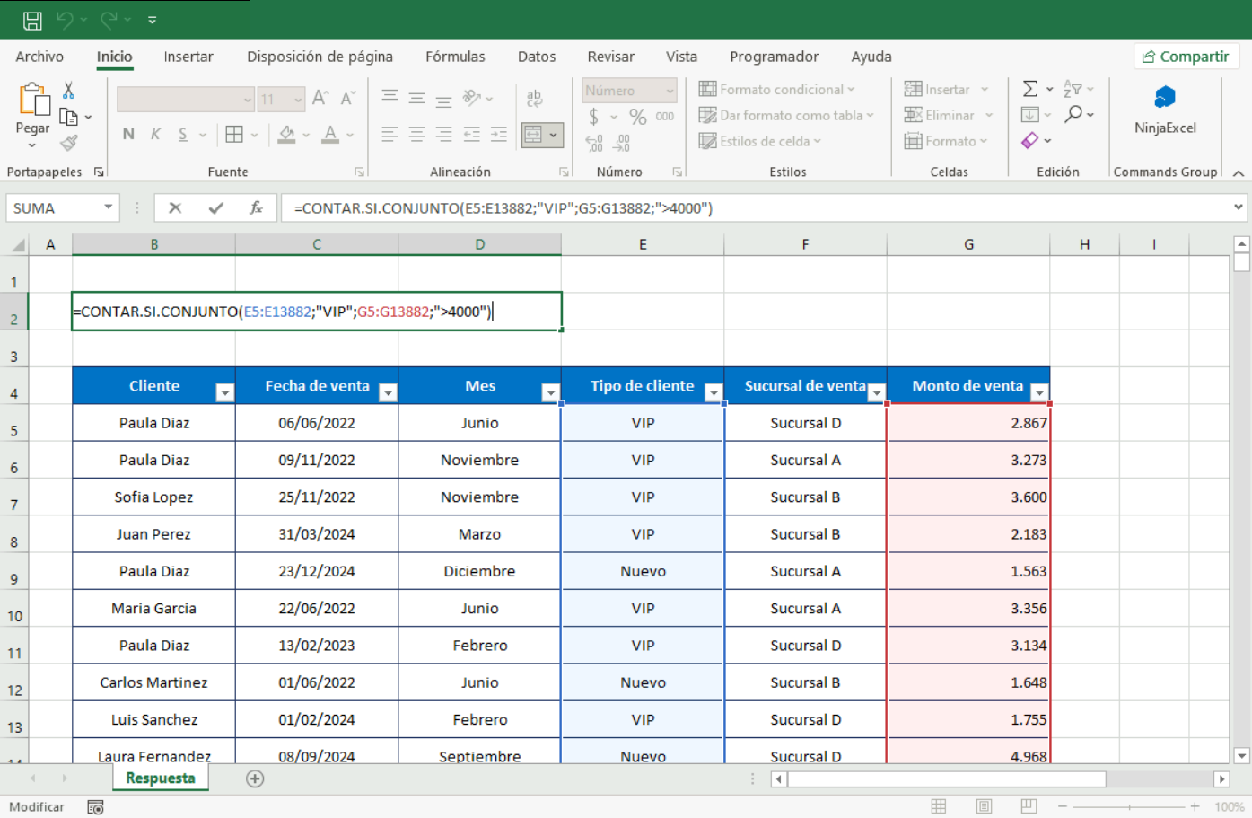 Ejemplo: En este ejercicio, se busca sumar las ventas hechas a clientes distintos a Andrés Ruiz (<>) en el año 2023 (>=01/01/2023 y <=12/31/2023) y en la Sucursal B.