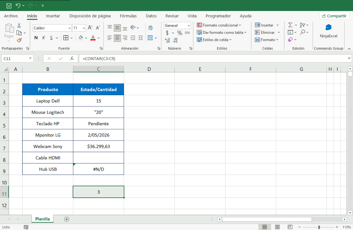 Como puedes ver en el ejemplo, el resultado de la función es 3, ya que CONTAR tiene un criterio muy estricto: solo cuantifica valores que Excel puede interpretar matemáticamente.
