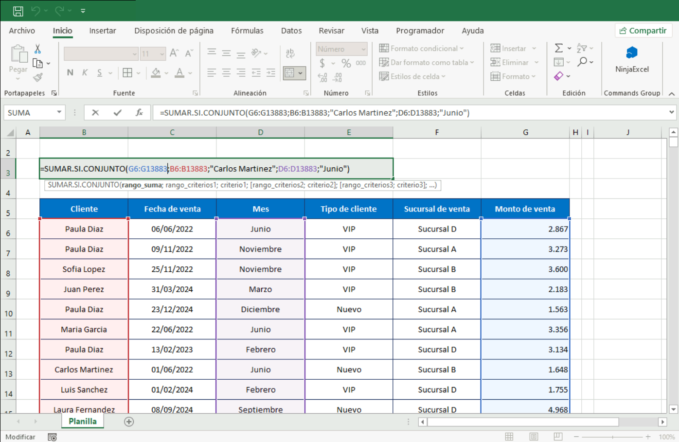 SUMAR.SI.CONJUNTO: Esta función te permite sumar hasta 127 criterios. Entonces, considerando el mismo ejemplo anterior, además de considerar al vendedor como primera condición, se puede incluir la venta de un producto específico en una sede determinada.