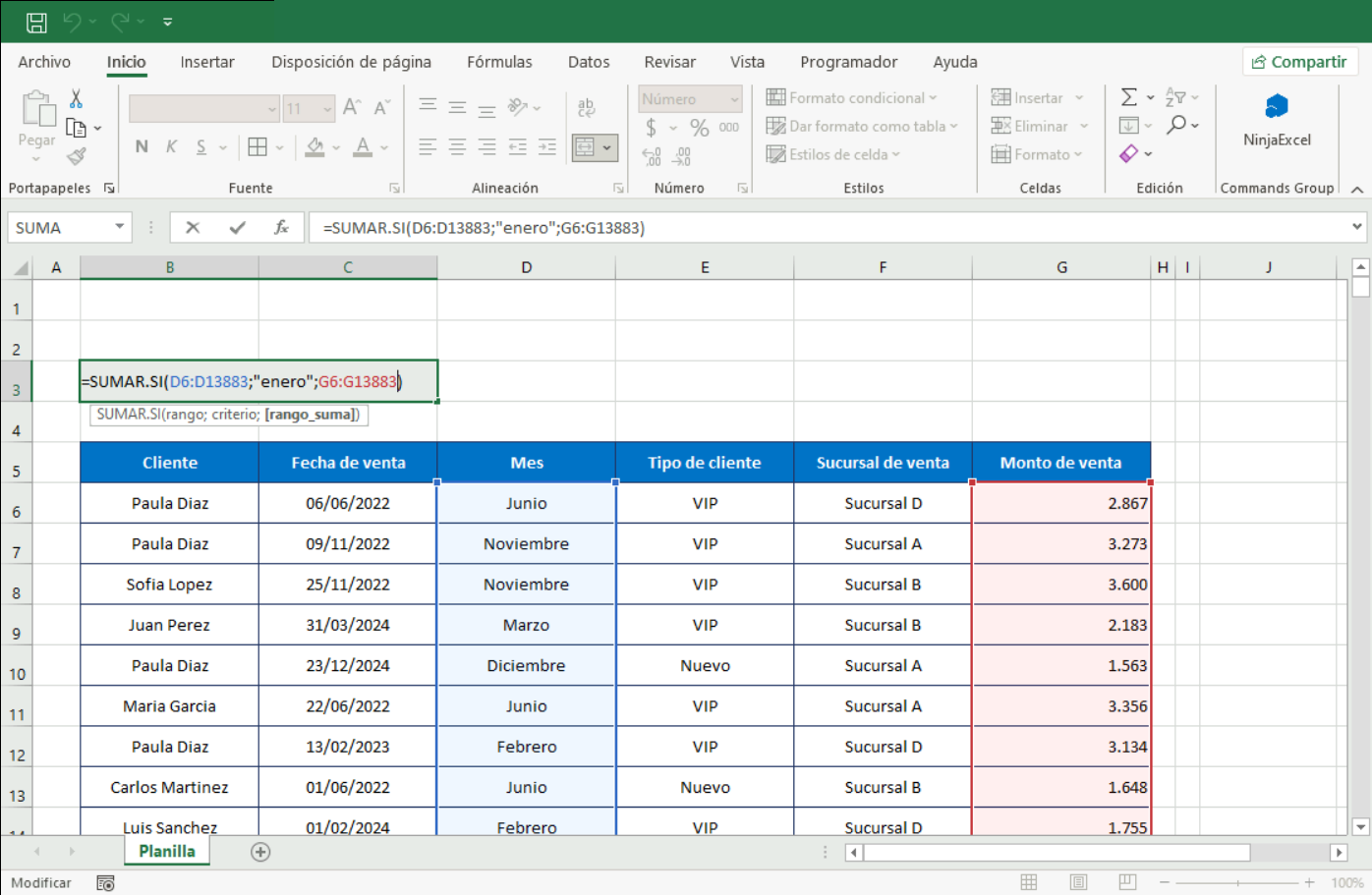 SUMAR.SI: Está diseñada para sumar un solo criterio. Por ejemplo, si tienes una tabla con “Vendedores”, “Ciudad” y “Monto Venta”, puedes calcular solo lo que vendió uno de los vendedores como condición. Su sintaxis considera dónde buscar la información (rango), lo que buscas (el criterio) y qué va a sumar ese criterio.