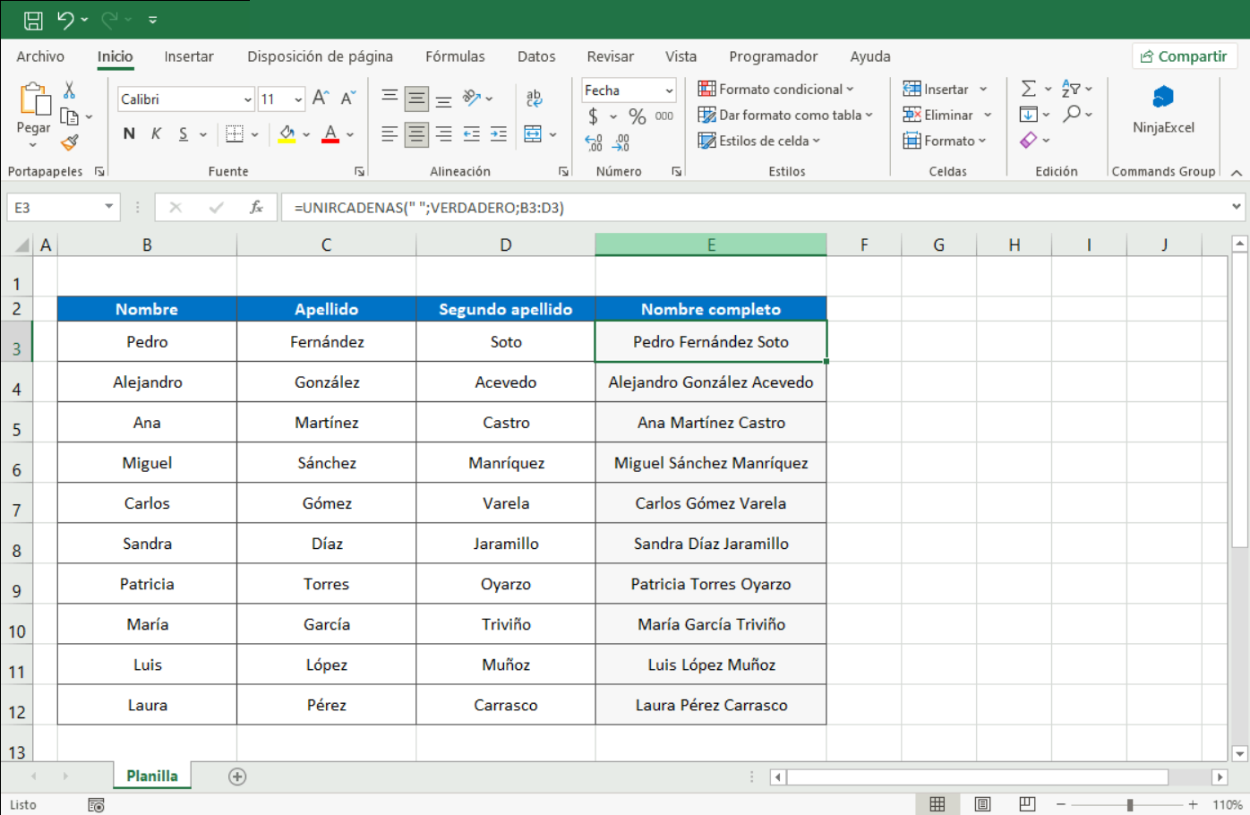 Para evitar este problema, UNIRCADENAS surge como una función clave en la versión 2019 de Excel, ya que permite incluir un separador automático e ignorar celdas vacías. Por ejemplo, si tienes los datos de Nombre, Apellido y Segundo Apellido, con UNIRCADENAS puedes obtener el resultado separado por espacios o el separador que especifiques.