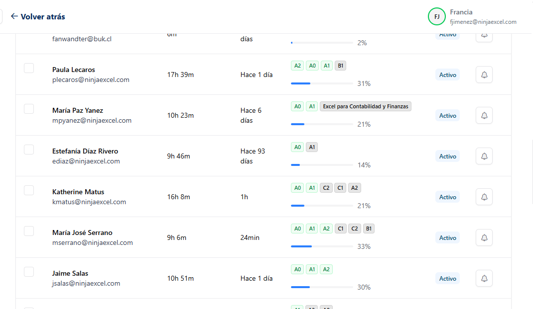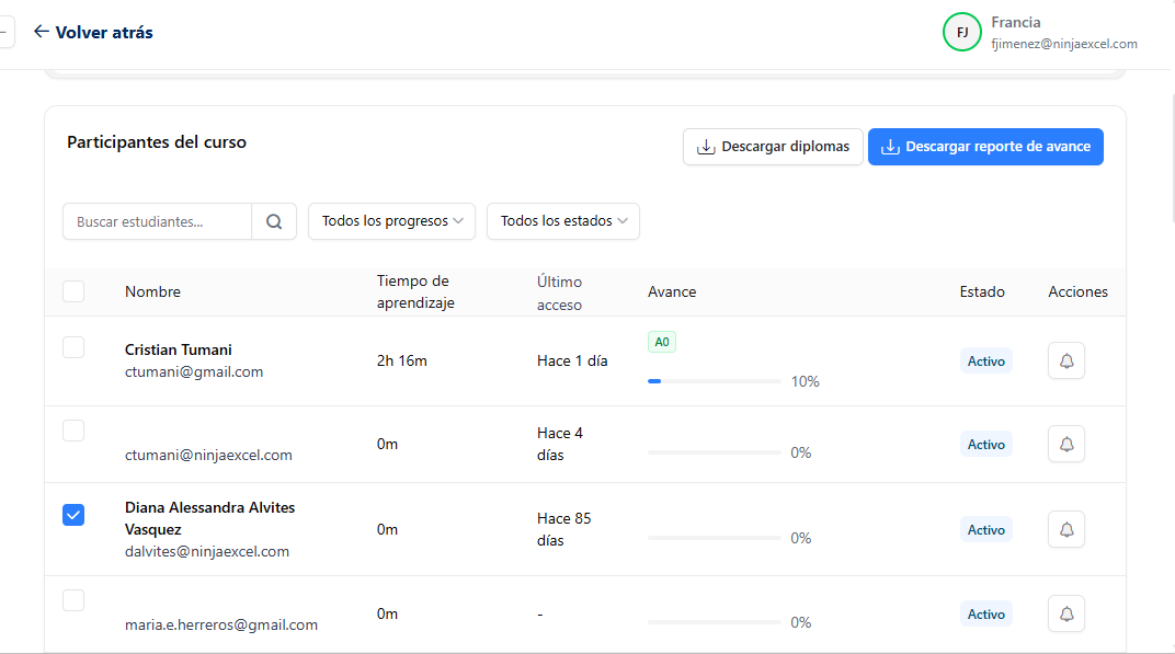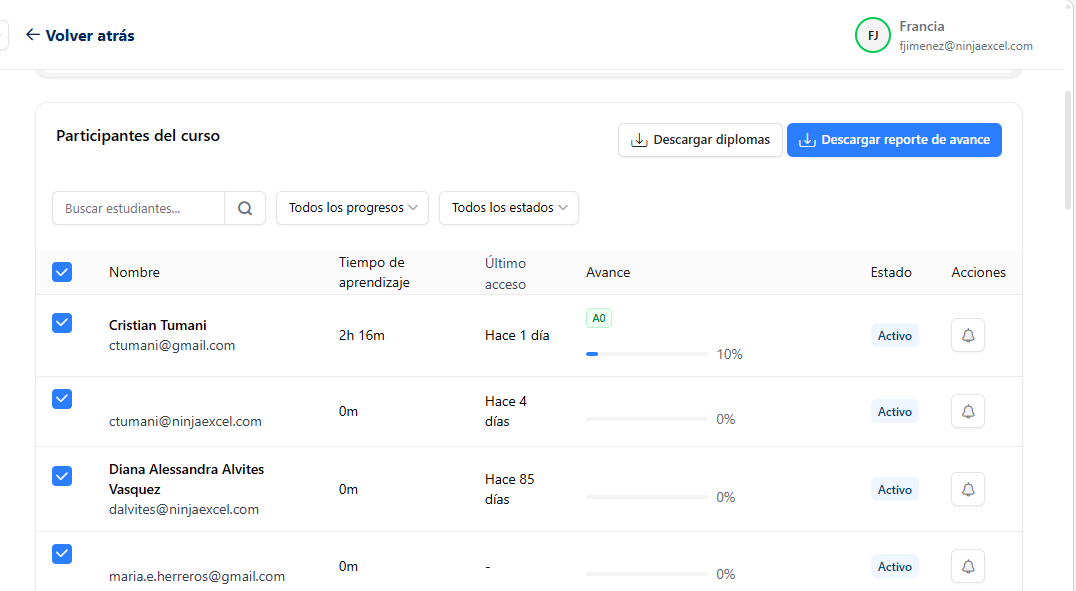 Dentro de la capacitación podrás visualizar la lista de estudiantes inscritos y su estado de avance.