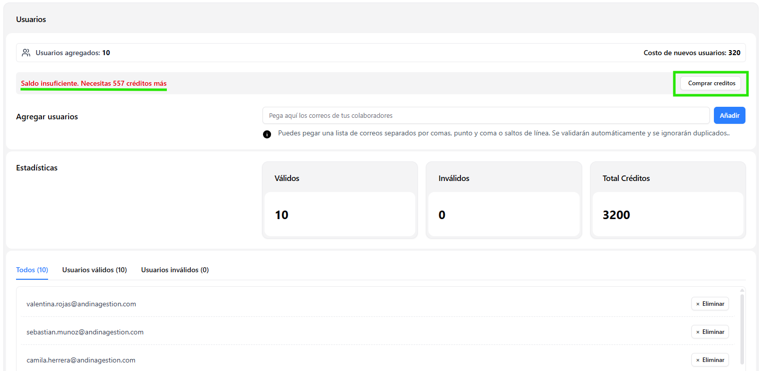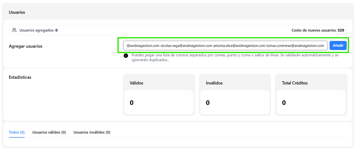 Al añadir usuarios, podrás verificar la cantidad de correos válidos –los cuales están listos para ser añadidos–, los inválidos –que no se añadirán– y el valor por usuario y total en créditos.