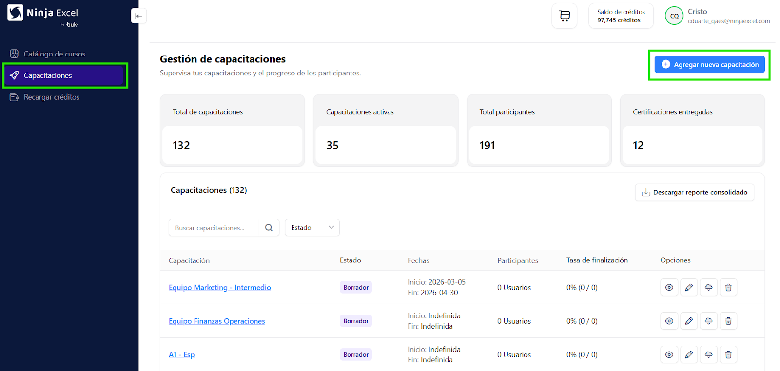 Desde el Perfil Administrador puedes gestionar todas las acciones relacionadas con las capacitaciones de Excel de tus colaboradores. Para iniciar, deberás crear y configurar las capacitaciones para dar acceso a los usuarios estudiantes. Para realizar esta acción deberás tener suficientes créditos. Si no los tienes, te mostraremos cómo adquirirlos en el camino.