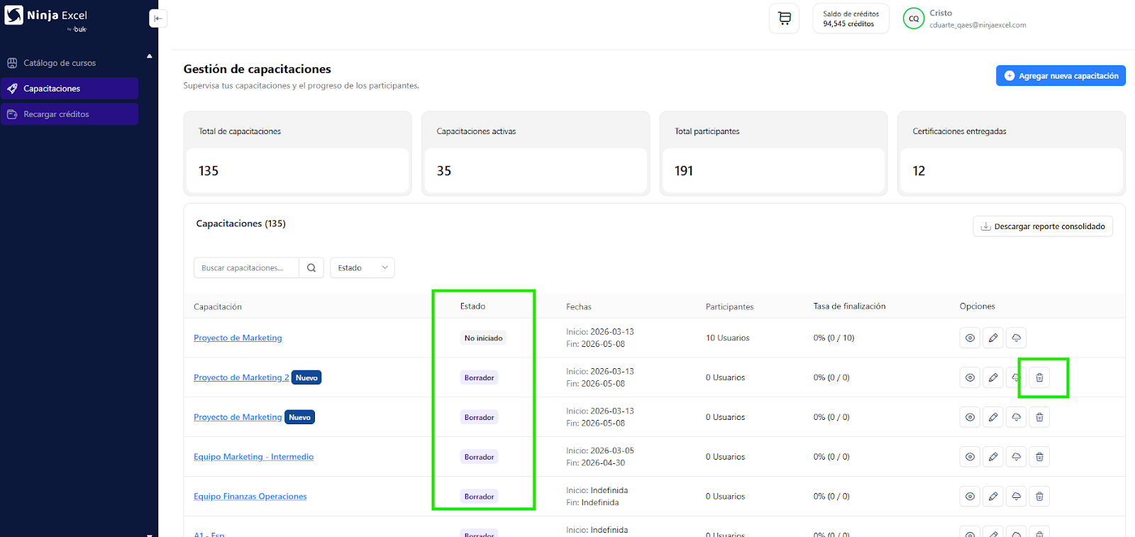 Puedes revisar y diferenciar las capacitaciones que estén guardadas como borrador de las confirmadas en la columna Estado de la pestaña Capacitaciones. Si cometiste un error y deseas volver a empezar, en esta misma pestaña puedes eliminar las capacitaciones guardadas como borrador presionando el ícono de basurero de la columna Opciones (última columna al lado izquierdo de la pantalla).