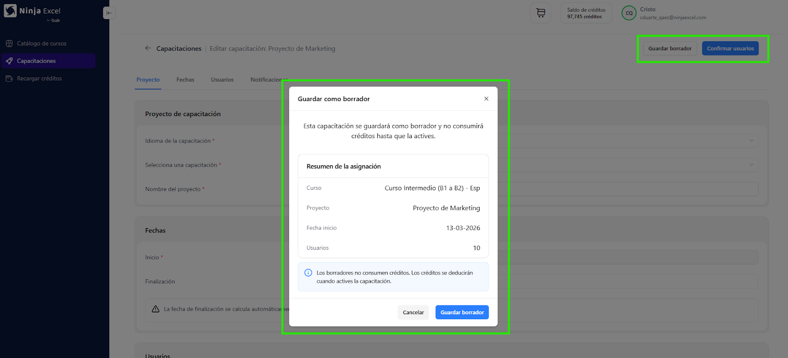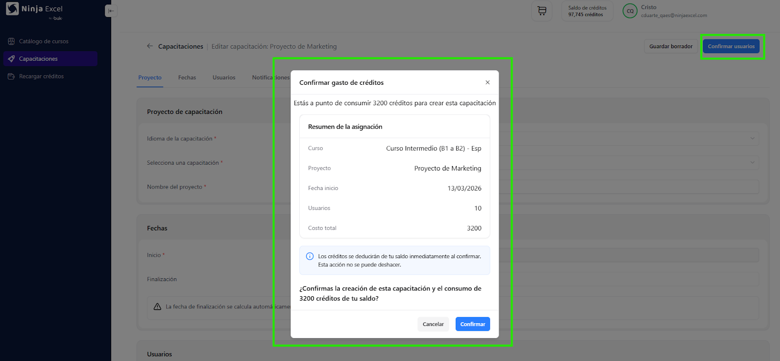 Si deseas confirmar la capacitación, presiona “Confirmar usuarios” (Imagen 2). Esto SÍ consumirá créditos y no te permitirá modificar nada (solo podrás agregar participantes y cambiar la fecha de inicio hasta el día anterior a la fecha establecida).