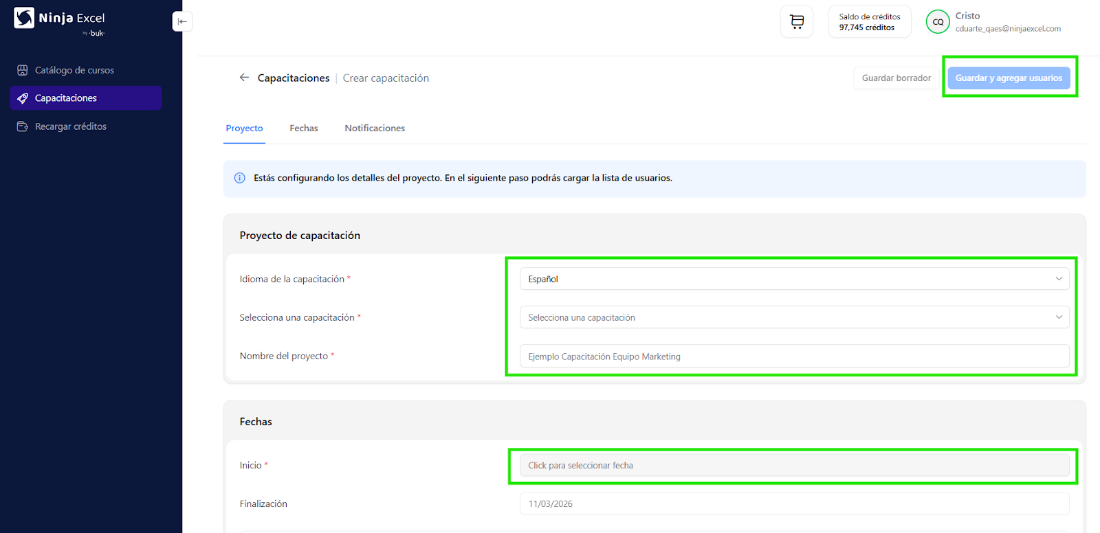 Nombra el proyecto: puedes asignar el nombre que prefieras, ya que te servirá para diferenciar, por ejemplo, 2 capacitaciones iguales que se asignaron a grupos de estudiantes distintos.