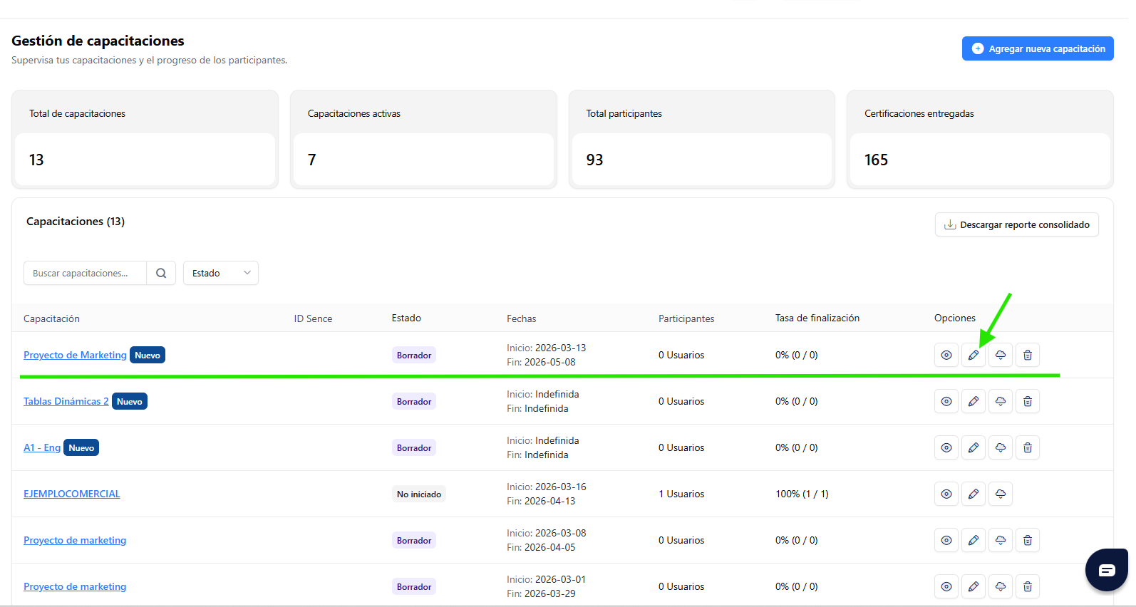 Presiona el Lápiz (editar capacitación) para seguir con el punto 5 de este artículo.