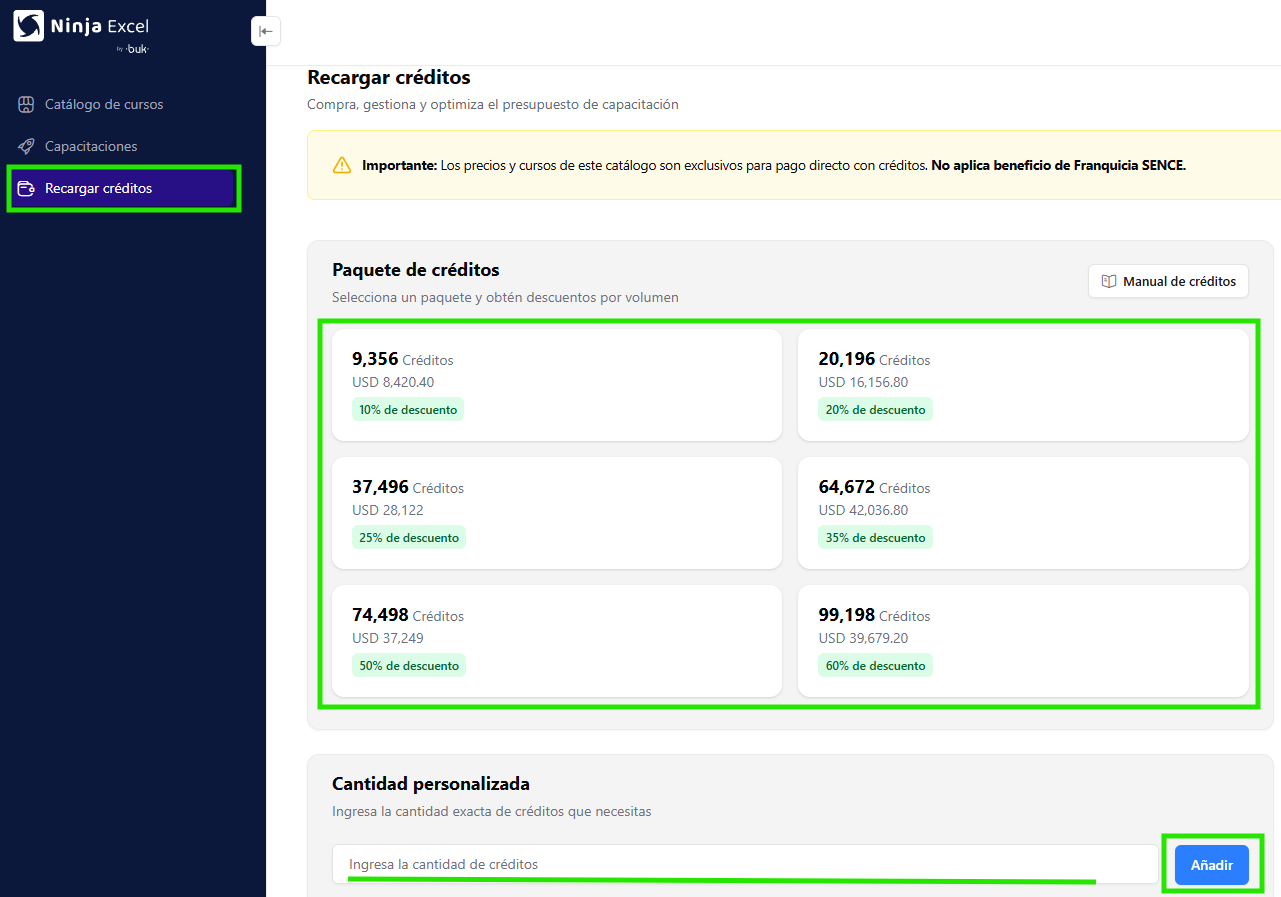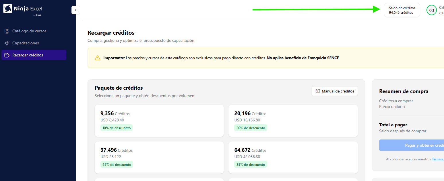 Considera que puedes adquirir créditos durante la creación de una capacitación, de modo que puedas comprar la cantidad exacta que necesitas.