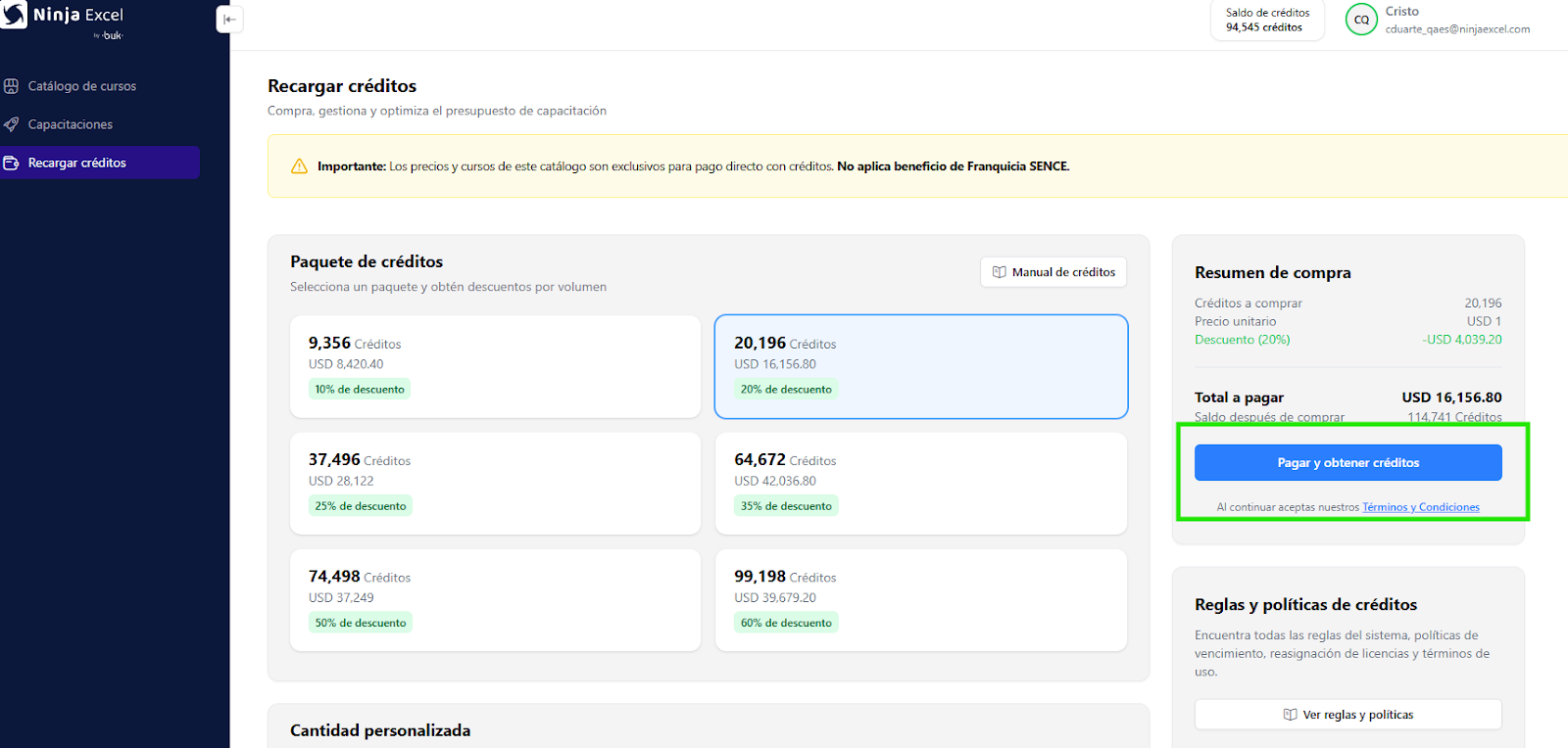 Tip: Considera que los descuentos por volumen de los paquetes de créditos se aplican a todas las modalidades de compra.