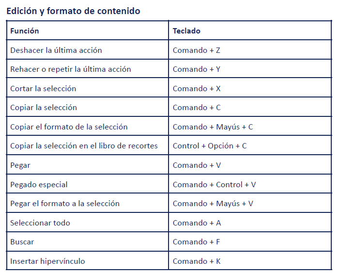 Listado de funciones comunes en Excel usando la tecla “Comando”: