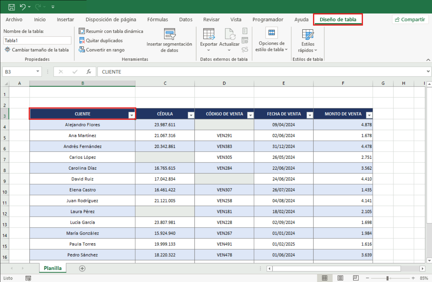 Problema: No encontrar una pestaña específica, como “Diseño de Tabla”