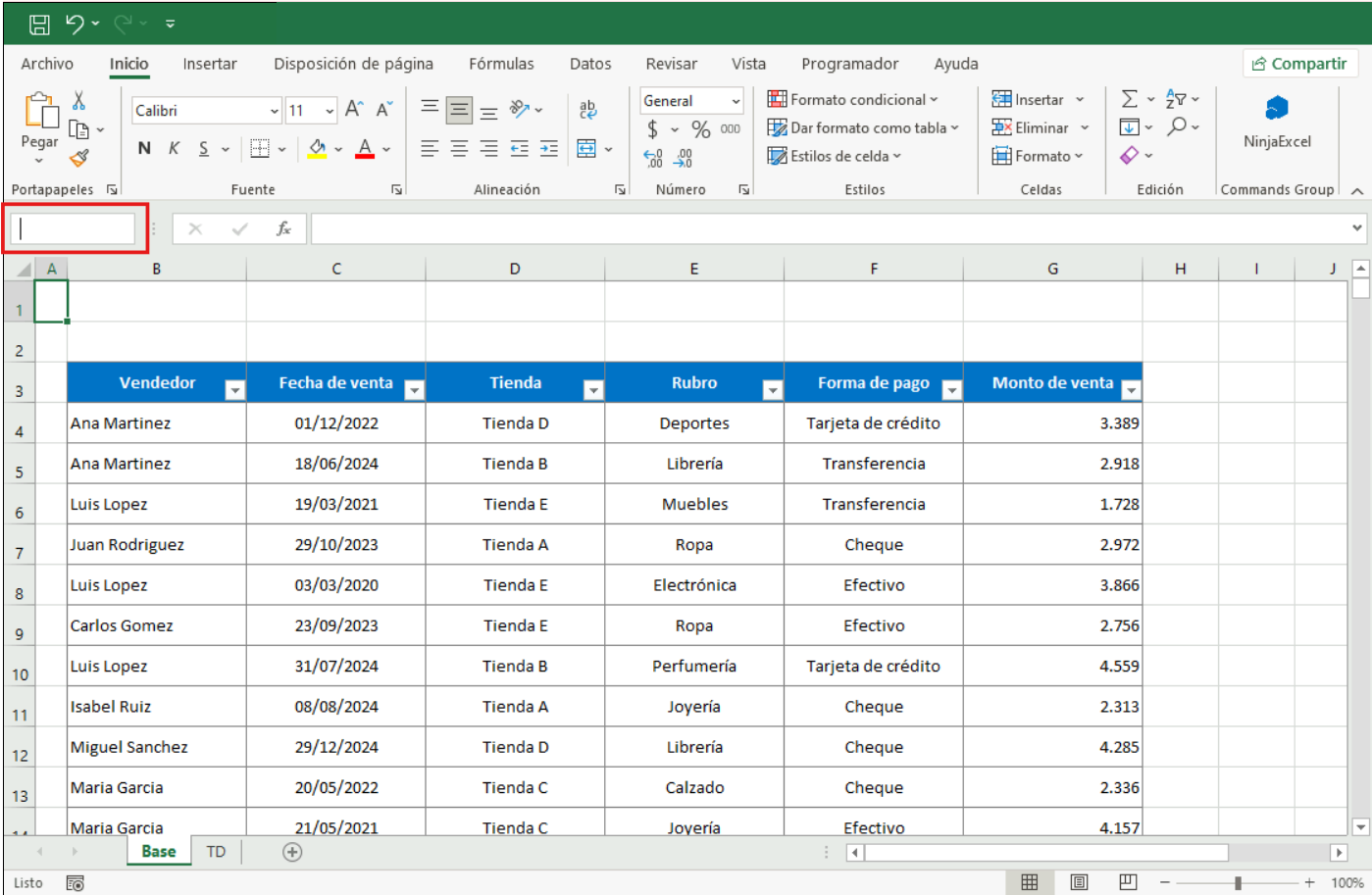 Uso del Cuadro de Nombres: En lugar de desplazarte manualmente, puedes escribir la dirección de la celda en el Cuadro de Nombres y presionar Enter.