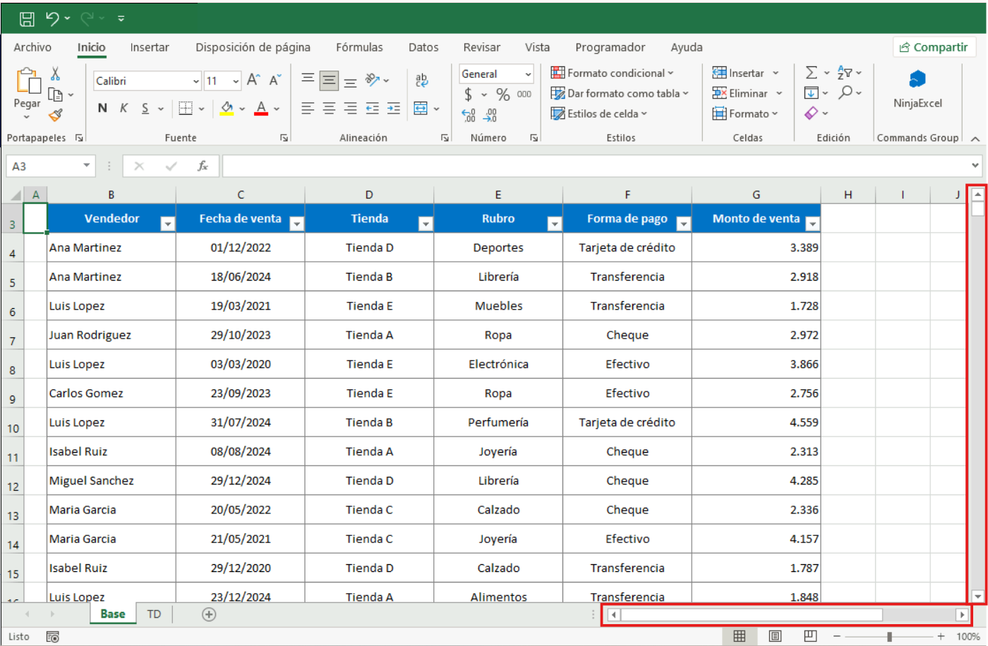 Barras de desplazamiento: Utiliza la barra vertical (derecha) y horizontal (inferior) para moverte rápidamente por la cuadrícula.