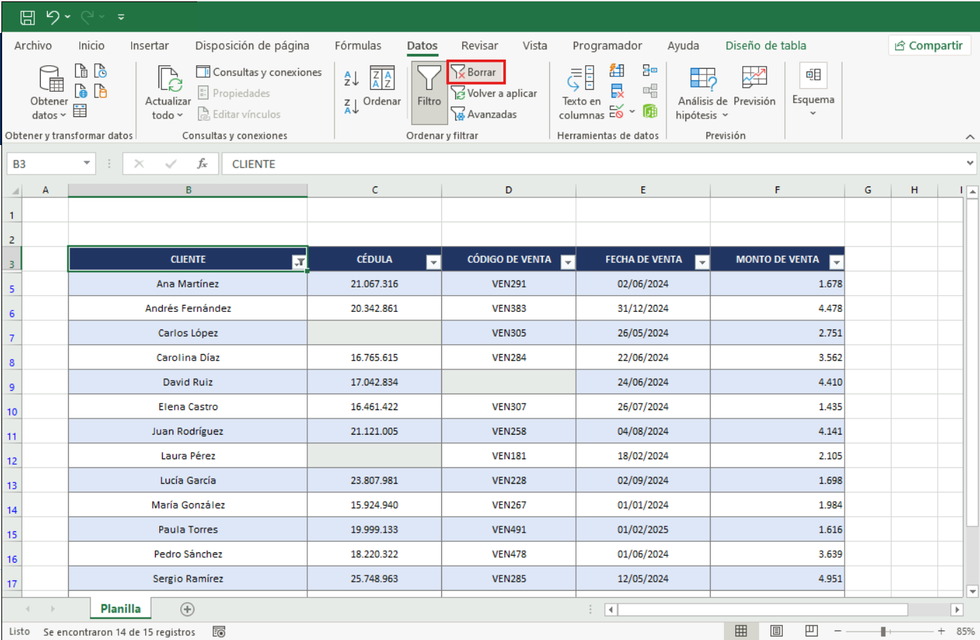 Solución: A veces, cuando tienes una planilla con filtros aplicados, podrías creer que faltan datos o que el archivo está dañado; para solucionarlo, verifica si aparece el ícono del embudo en los encabezados. Ve a la pestaña “Datos” y haz clic en “Borrar” (filtro) para mostrar toda la información de nuevo.