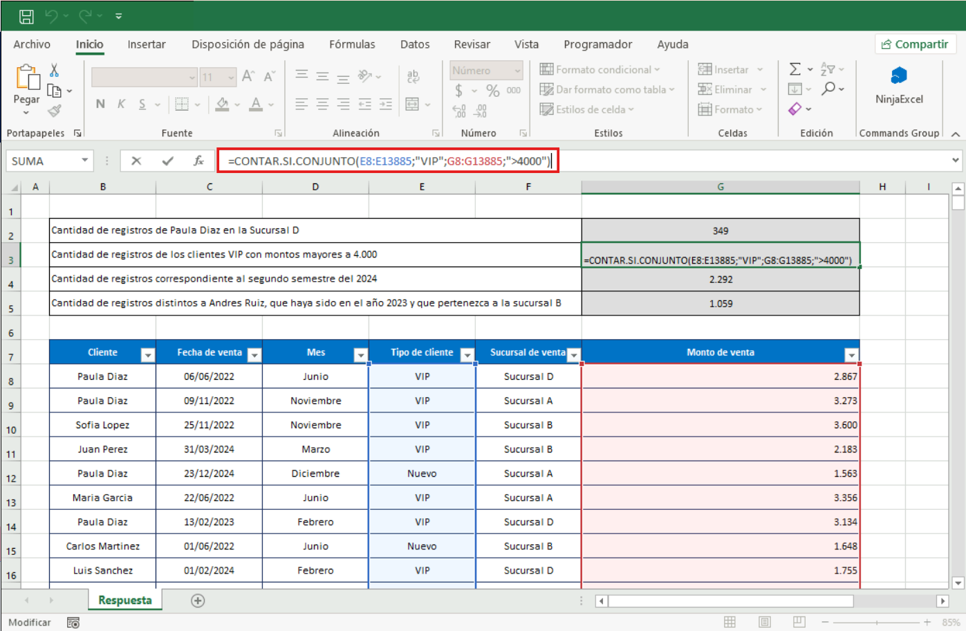 Solución: Recuerda que todo texto (ej. “Aprobado” o “VIP”) o criterio con operadores lógicos dentro de una función (ej. “>3000”, “<>Andres Ruiz”) debe ir con doble comillas para que Excel “lea” que debe tomar la operación completa.