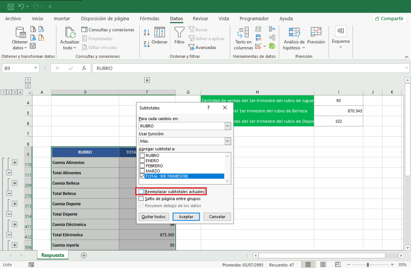 Solución: Al aplicar el segundo subtotal, debes desmarcar la casilla que dice "Reemplazar subtotales actuales" en el cuadro de diálogo. De lo contrario, el nuevo cálculo borrará el anterior.