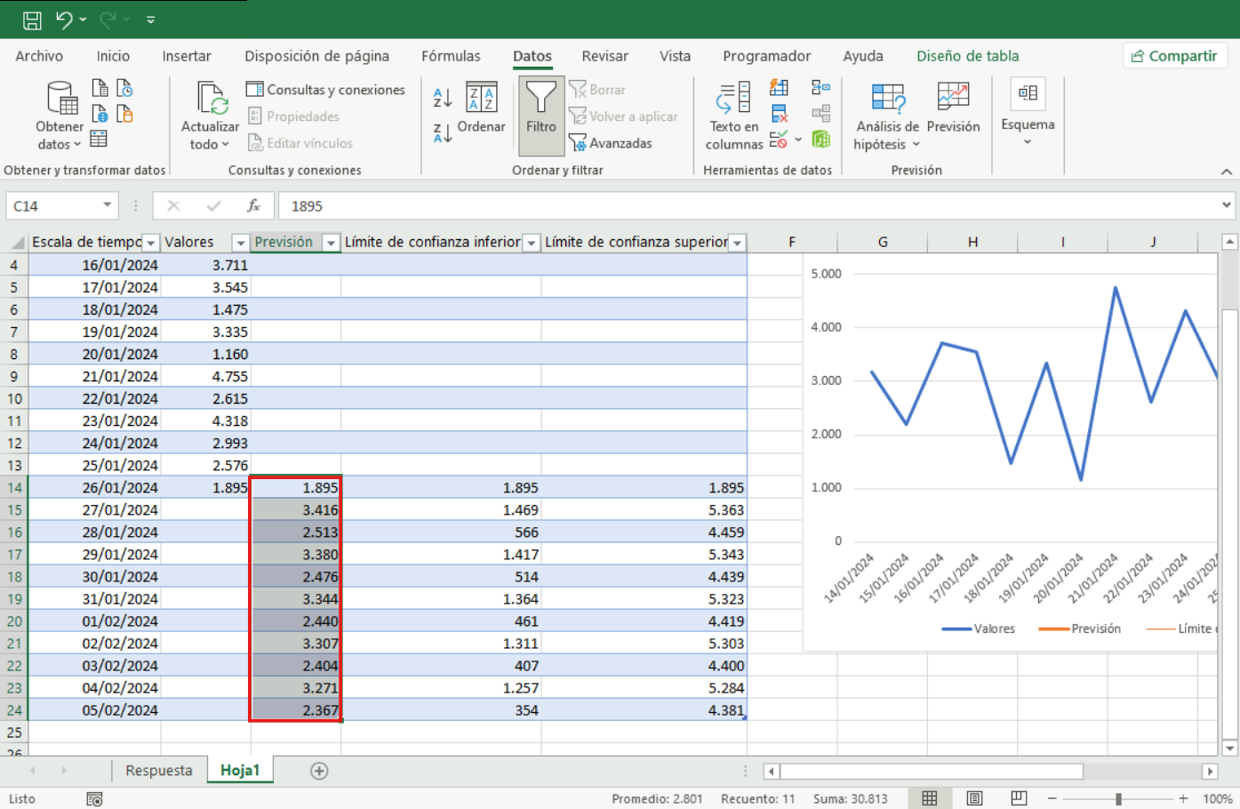 Solución: La herramienta genera una tabla con valores proyectados. Debes copiar únicamente el rango de los montos proyectados (en el rango C14:C24) y pegarlos en tu hoja original.