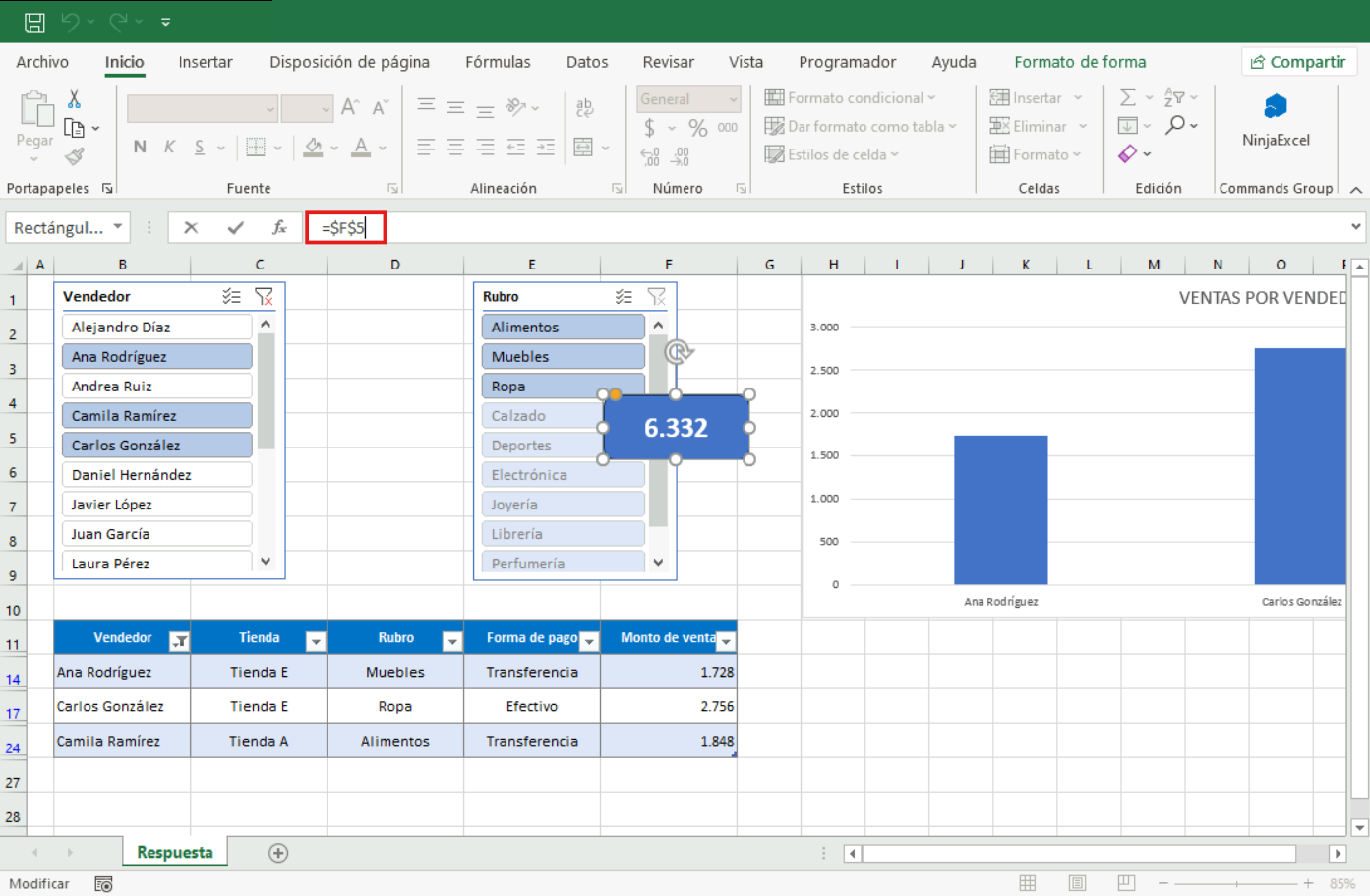 Solución: Para vincular una forma a una celda (ej. F5), selecciona el borde del rectángulo, haz clic en la barra de fórmulas, escribe = y luego haz clic en la celda F5. No escribas el texto dentro del cuadro manualmente.