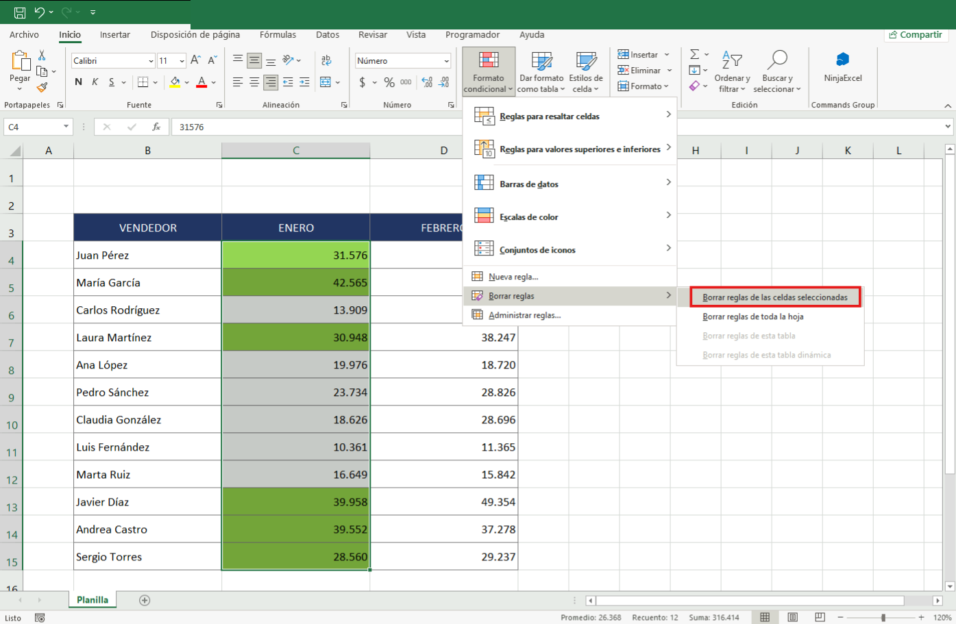 Solución: Si usas la opción "Borrar todo", eliminarás los datos. Para quitar solo el formato sin afectar la información, debes ir a Formato condicional > Borrar reglas y elegir "de las celdas seleccionadas".