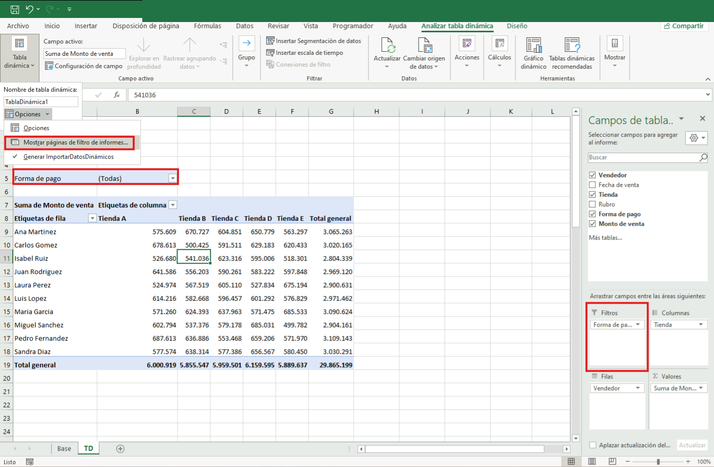Solución: Esta herramienta solo se habilita si tienes al menos un campo ubicado en el área de FILTROS de la tabla dinámica. Si el campo está en Filas o Columnas, la opción aparecerá en gris.