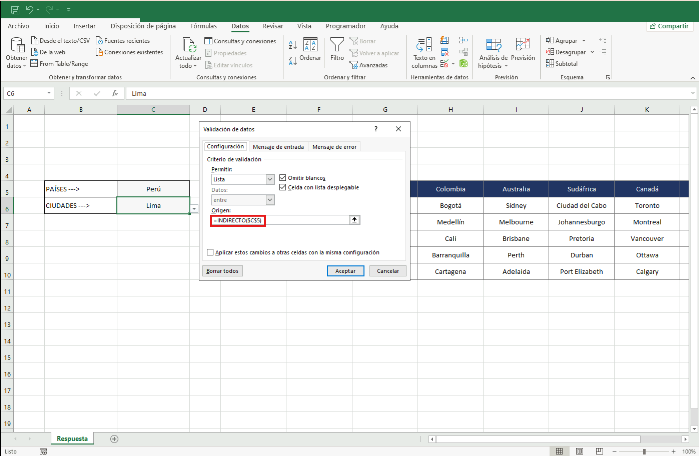 Solución: Primero, crea los nombres de rangos desde la selección usando “Fila superior”. Luego, al aplicar la validación de datos en la celda que tendrá la segunda lista desplegable, debes utilizar la función INDIRECTO en el origen y asegurarte de seleccionar manualmente la celda para que se fije con una referencia absoluta.