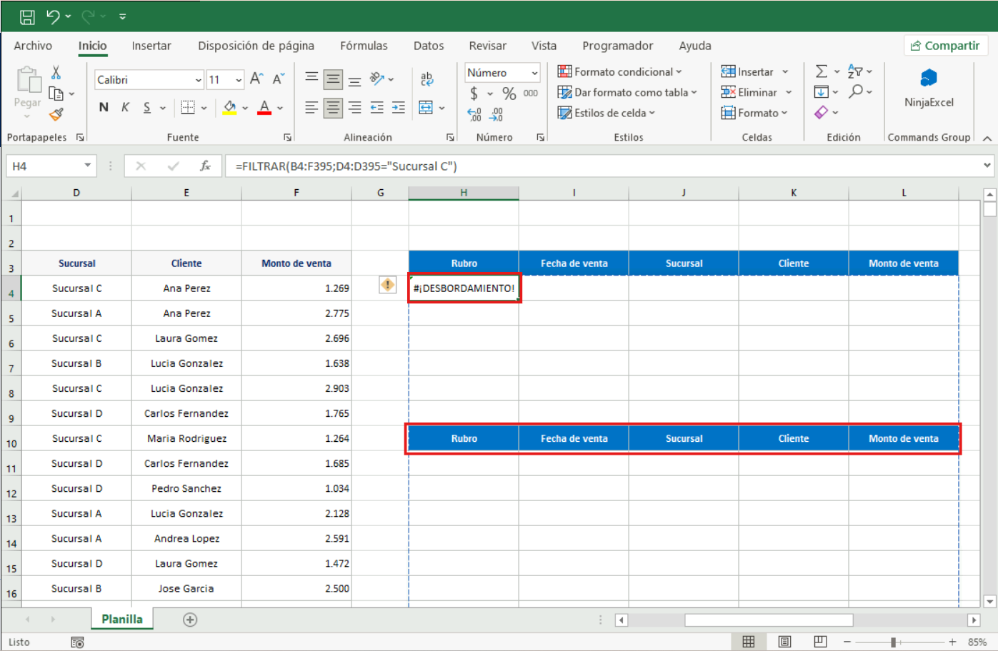 Solución: Estas funciones utilizan matrices dinámicas. Asegúrate de que las celdas hacia abajo y hacia la derecha de la fórmula estén totalmente vacías. Cualquier dato o espacio invisible bloqueará el desbordamiento.