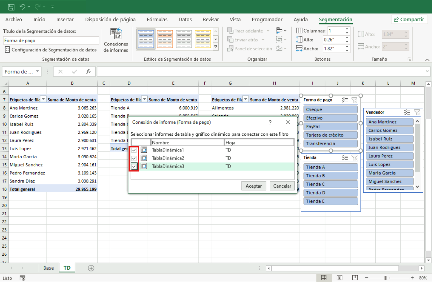 Solución: Haz clic derecho en el segmentador, ve a "Conexiones de informe" y asegúrate de marcar todas las tablas dinámicas que deben responder a ese filtro.